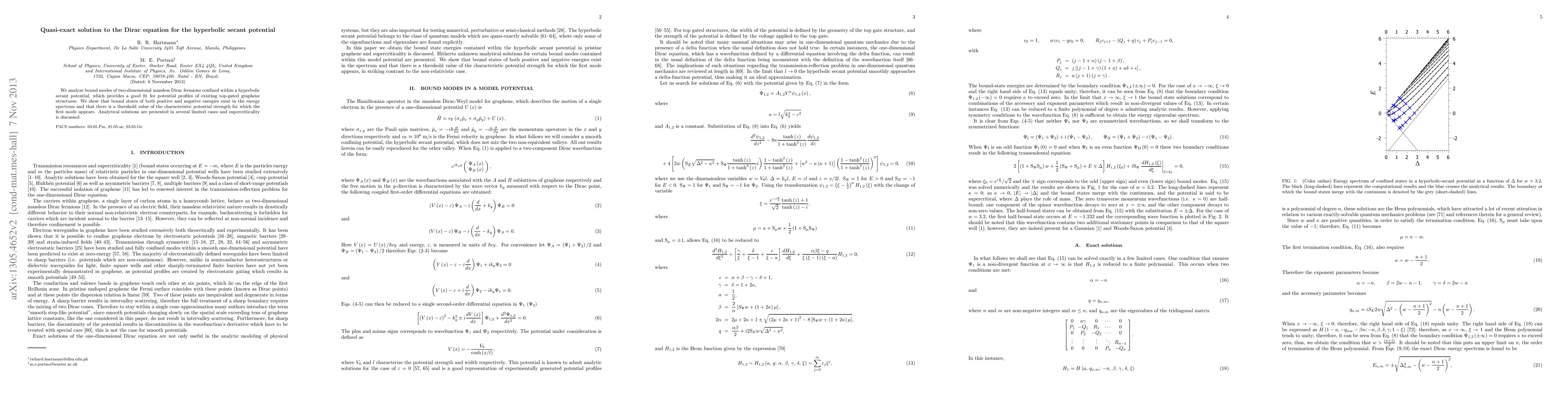 This paper presents a quasi-exact solution to the Dirac equation for a hyperbolic secant potential, demonstrating the existence of bound states for massless Dirac fermions in two-dimensional graphene structures. It identifies a critical potential strength for the emergence of the first bound mode and discusses analytical solutions in specific cases.