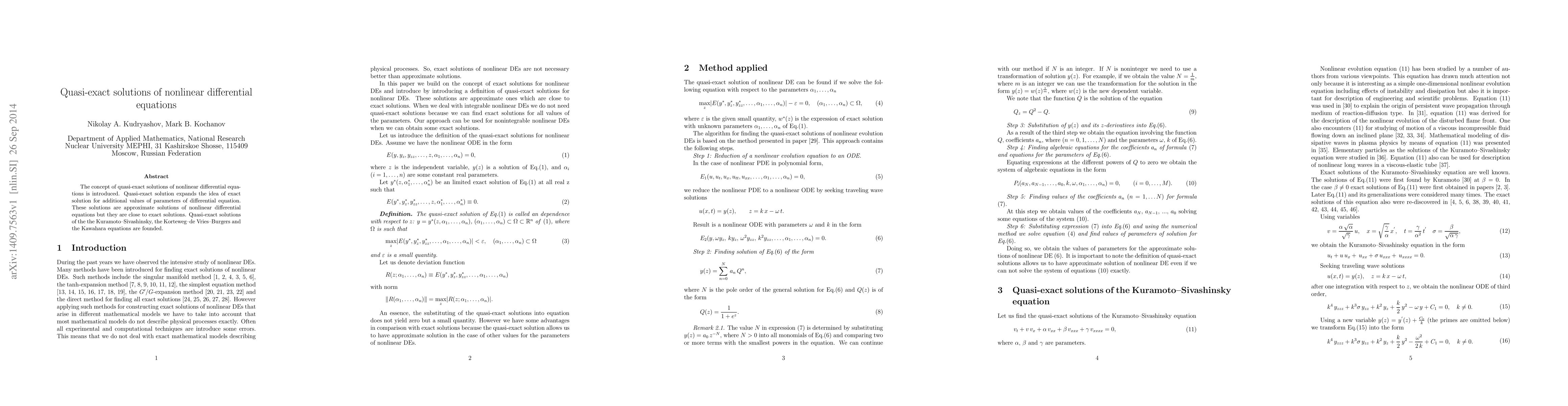 This paper introduces quasi-exact solutions for nonlinear differential equations, expanding the notion of exact solutions to include approximate solutions that are close to exact for certain parameter values. It demonstrates these solutions for the Kuramoto-Sivashinsky, Korteweg-de Vries-Burgers, and Kawahara equations.