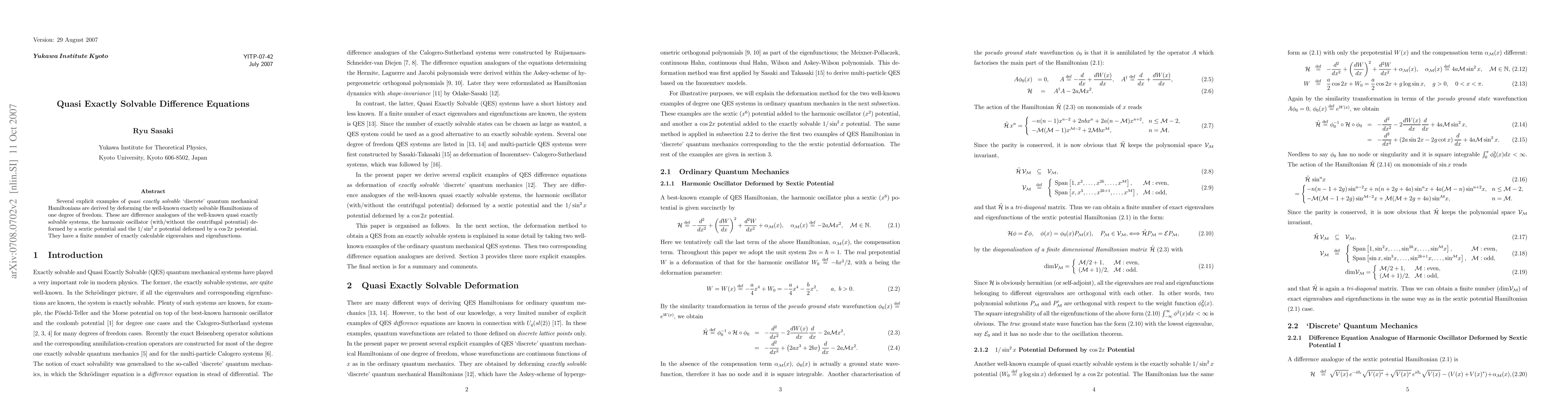 This paper presents explicit examples of quasi exactly solvable difference equations derived by deforming classical Hamiltonians, such as the harmonic oscillator and the 1/sin^2x potential, introducing finite, calculable eigenvalues and eigenfunctions.