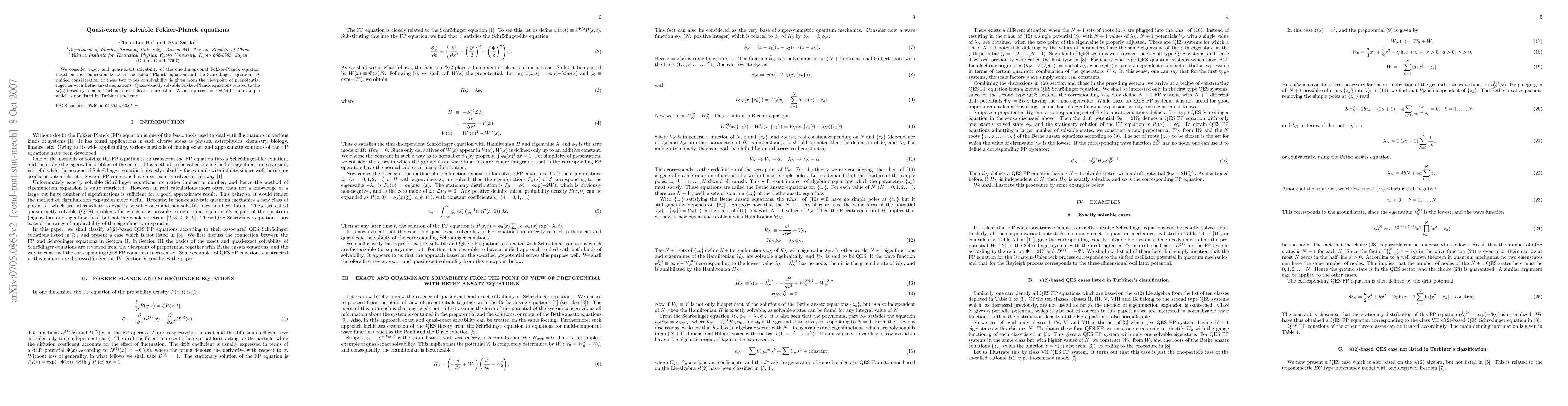 This paper explores the exact and quasi-exact solvability of one-dimensional Fokker-Planck equations by linking them to Schrödinger equations, using prepotential and Bethe ansatz. It identifies quasi-exactly solvable Fokker-Planck equations associated with $sl(2)$-based systems and presents an additional $sl(2)$-based example not previously listed.