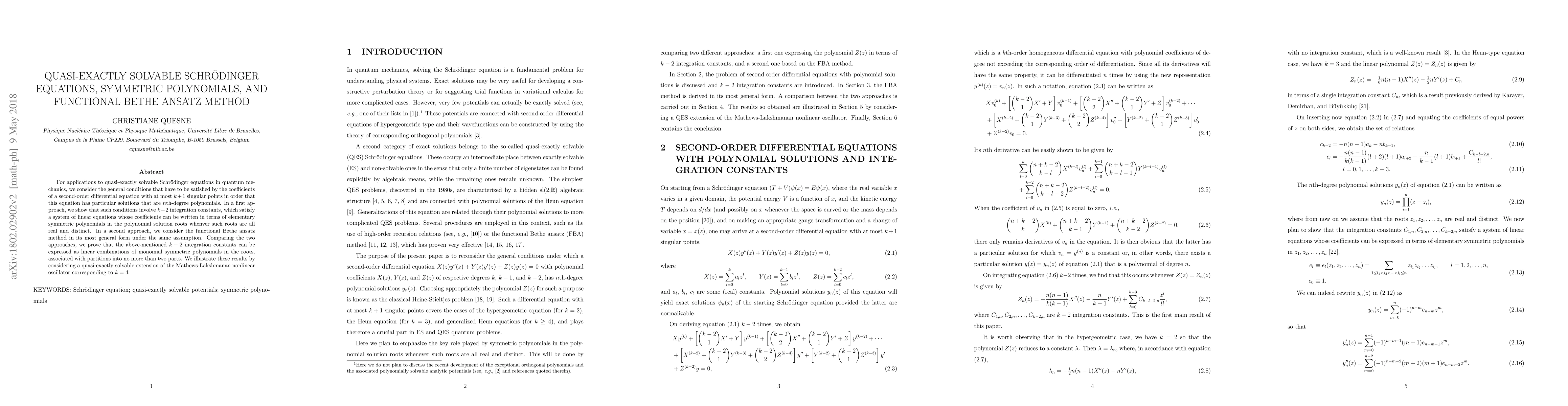 For applications to quasi-exactly solvable Schr\"odinger equations in quantum mechanics, we consider the general conditions that have to be satisfied by the coefficients of a second-order differential equation with at most $k+1$ singular points in order that this equation has particular solutions that are $n$th-degree polynomials. In a first approach, we show that such conditions involve $k-2$ integration constants, which satisfy a system of linear equations whose coefficients can be written in terms of elementary symmetric polynomials in the polynomial solution roots whenver such roots are all real and distinct. In a second approach, we consider the functional Bethe ansatz method in its most general form under the same assumption. Comparing the two approaches, we prove that the above-mentioned $k-2$ integration constants can be expressed as linear combinations of monomial symmetric polynomials in the roots, associated with partitions into no more than two parts. We illustrate these results by considering a quasi-exactly solvable extension of the Mathews-Lakshmanan nonlinear oscillator corresponding to $k=4$.