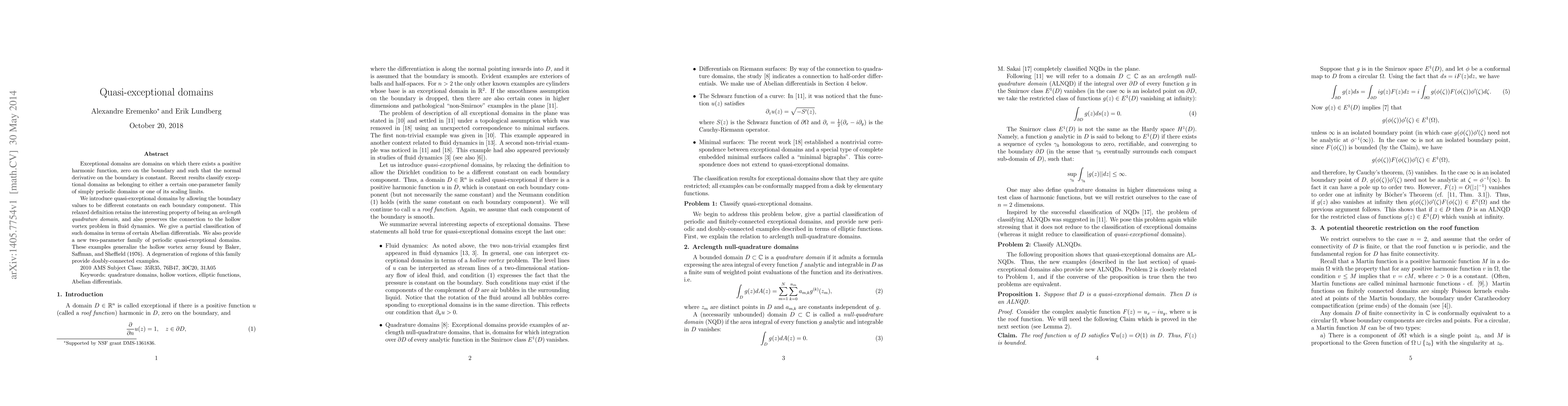Exceptional domains are domains on which there exists a positive harmonic function, zero on the boundary and such that the normal derivative on the boundary is constant. Recent results classify exceptional domains as belonging to either a certain one-parameter family of simply periodic domains or one of its scaling limits. We introduce quasi-exceptional domains by allowing the boundary values to be different constants on each boundary component. This relaxed definition retains the interesting property of being an \emph{arclength quadrature domain}, and also preserves the connection to the hollow vortex problem in fluid dynamics. We give a partial classification of such domains in terms of certain Abelian differentials. We also provide a new two-parameter family of periodic quasi-exceptional domains. These examples generalize the hollow vortex array found by Baker, Saffman, and Sheffield (1976). A degeneration of regions of this family provide doubly-connected examples.