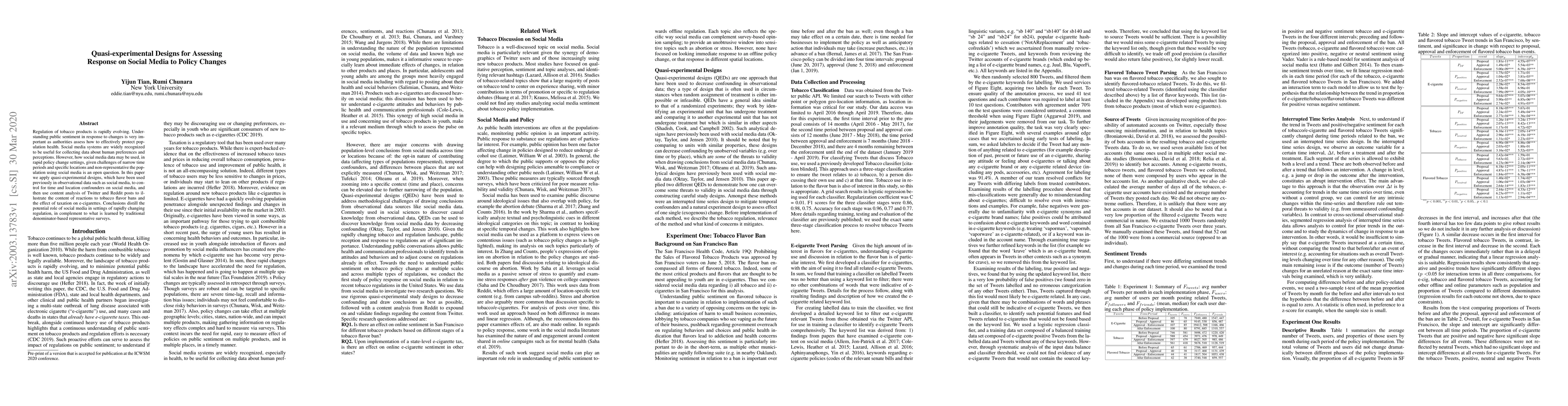 This paper employs quasi-experimental designs to analyze social media reactions to tobacco policy changes, controlling for time and location confounders. Findings from Twitter and Reddit content reveal public sentiment towards flavor bans and e-cigarette taxation, highlighting social media's potential in supplementing traditional survey data for understanding public health policy impacts.