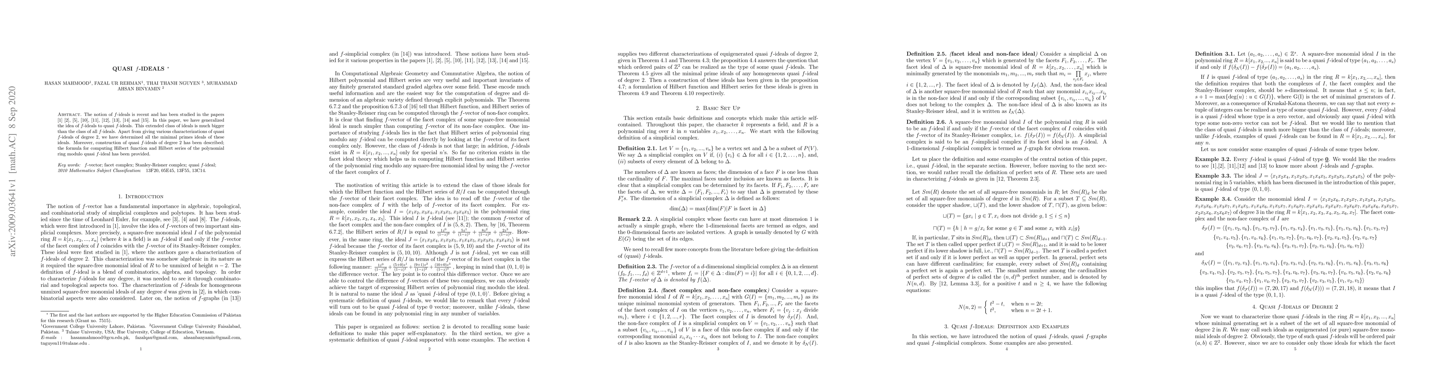 This paper generalizes the concept of f-ideals to quasi f-ideals, providing characterizations of degree 2 quasi f-ideals and determining their minimal prime ideals. It also constructs degree 2 quasi f-ideals and offers formulas for computing their Hilbert function and series.