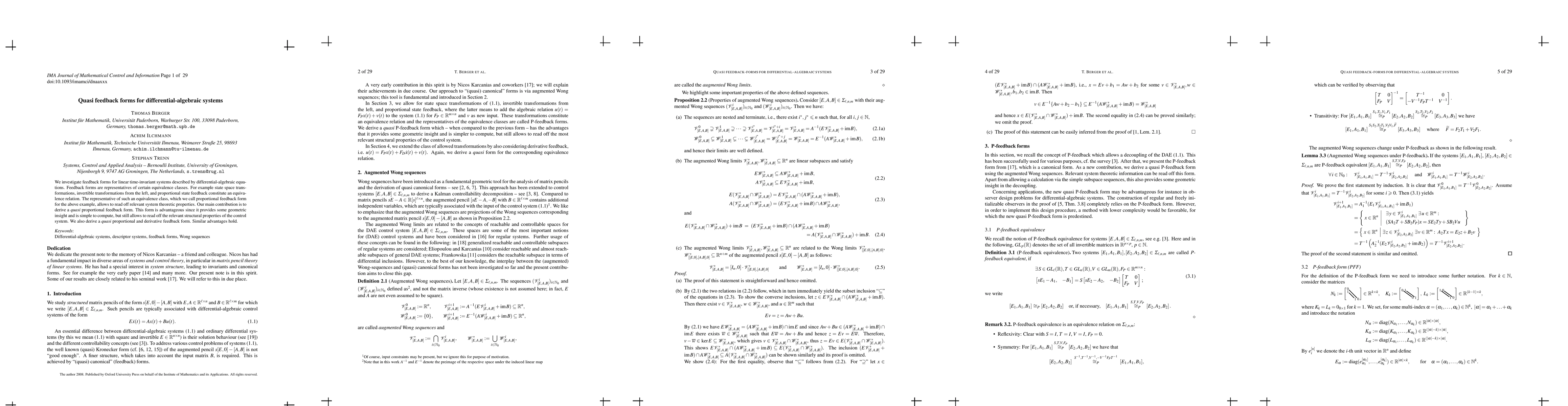 We investigate feedback forms for linear time-invariant systems described by differential-algebraic equations. Feedback forms are representatives of certain equivalence classes. For example state space transformations, invertible transformations from the left, and proportional state feedback constitute an equivalence relation. The representative of such an equivalence class, which we call proportional feedback form for the above example, allows to read off relevant system theoretic properties. Our main contribution is to derive a quasi proportional feedback form. This form is advantageous since it provides some geometric insight and is simple to compute, but still allows to read off the relevant structural properties of the control system. We also derive a quasi proportional and derivative feedback form. Similar advantages hold.