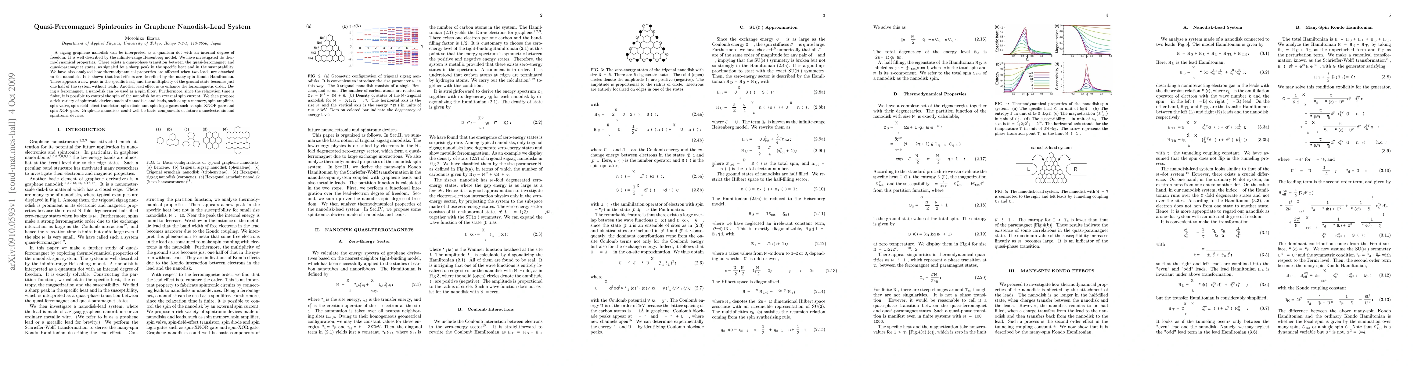 A zigzag graphene nanodisk can be interpreted as a quantum dot with an internal degree of freedom. It is well described by the infinite-range Heisenberg model. We have investigated its thermodynamical properties. There exists a quasi-phase transition between the quasi-ferromagnet and quasi-paramagnet states, as signaled by a sharp peak in the specific heat and in the susceptability. We have also analyzed how thermodynamical properties are affected when two leads are attached to the nanodisk. It is shown that lead effects are described by the many-spin Kondo Hamiltonian. There appears a new peak in the specific heat, and the multiplicity of the ground state becomes just one half of the system without leads. Another lead effect is to enhance the ferromagnetic order. Being a ferromagnet, a nanodisk can be used as a spin filter. Furthermore, since the relaxation time is finite, it is possible to control the spin of the nanodisk by an external spin current. We then propose a rich variety of spintronic devices made of nanodisks and leads, such as spin memory, spin amplifier, spin valve, spin-field-effect transistor, spin diode and spin logic gates such as spin-XNOR gate and spin-XOR gate. Graphene nanodisks could well be basic components of future nanoelectronic and spintronic devices.