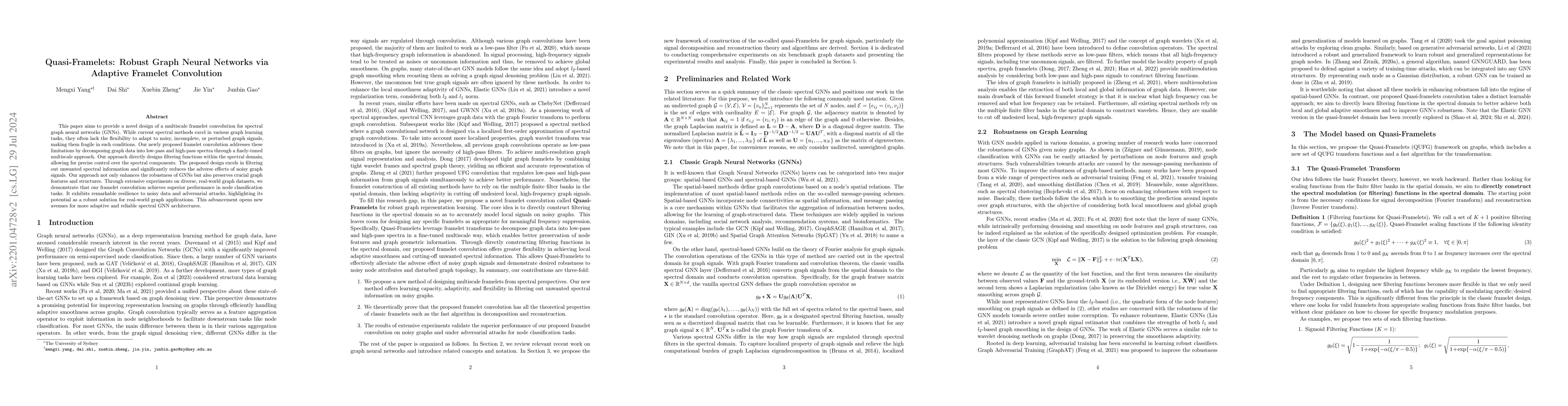 This paper introduces quasi-framelets convolution for spectral graph neural networks to enhance flexibility and robustness against noisy and incomplete graph data. The proposed method effectively captures both global and local graph structures, achieving superior performance in heterogeneous and homogeneous graph datasets.