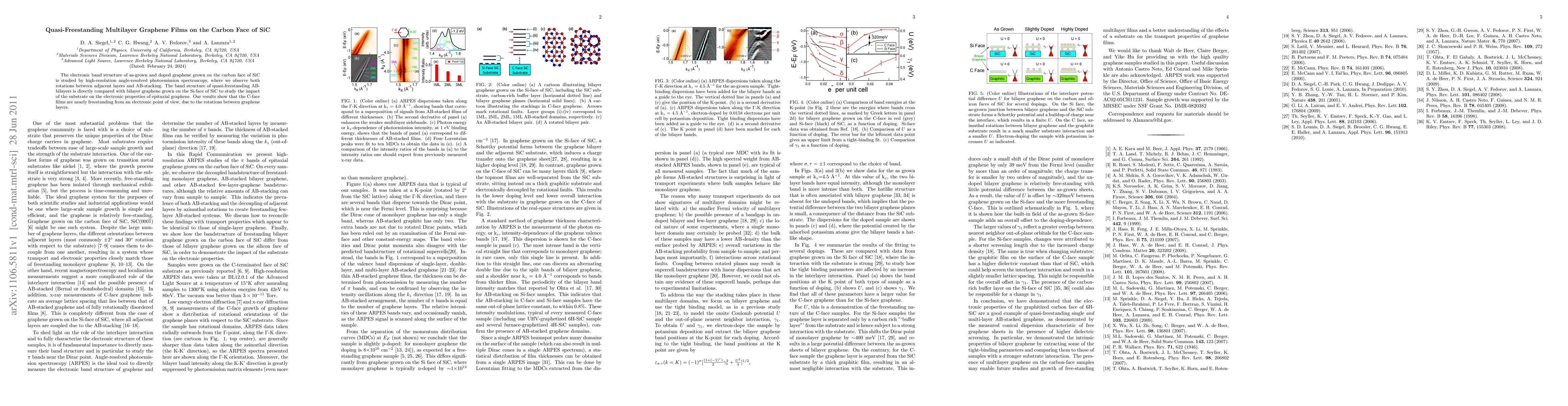 The electronic band structure of as-grown and doped graphene grown on the carbon face of SiC is studied by high-resolution angle-resolved photoemission spectroscopy, where we observe both rotations between adjacent layers and AB-stacking. The band structure of quasi-freestanding AB- bilayers is directly compared with bilayer graphene grown on the Si-face of SiC to study the impact of the substrate on the electronic properties of epitaxial graphene. Our results show that the C-face films are nearly freestanding from an electronic point of view, due to the rotations between graphene layers.
