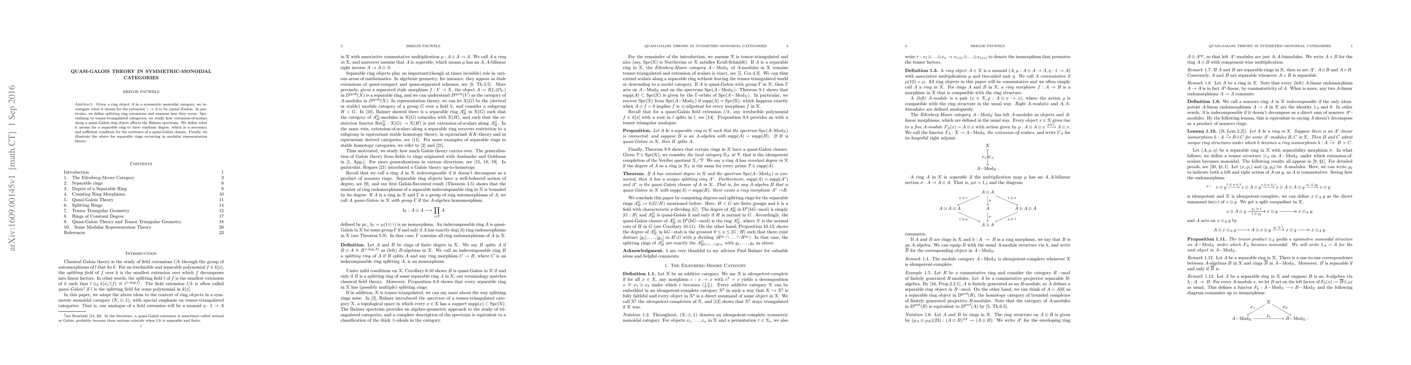 Given a ring object $A$ in a symmetric monoidal category, we investigate what it means for the extension $\mathbb{1}\rightarrow A$ to be (quasi-)Galois. In particular, we define splitting ring extensions and examine how they occur. Specializing to tensor-triangulated categories, we study how extension-of-scalars along a quasi-Galois ring object affects the Balmer spectrum. We define what it means for a separable ring to have constant degree, which is a necessary and sufficient condition for the existence of a quasi-Galois closure. Finally, we illustrate the above for separable rings occurring in modular representation theory.