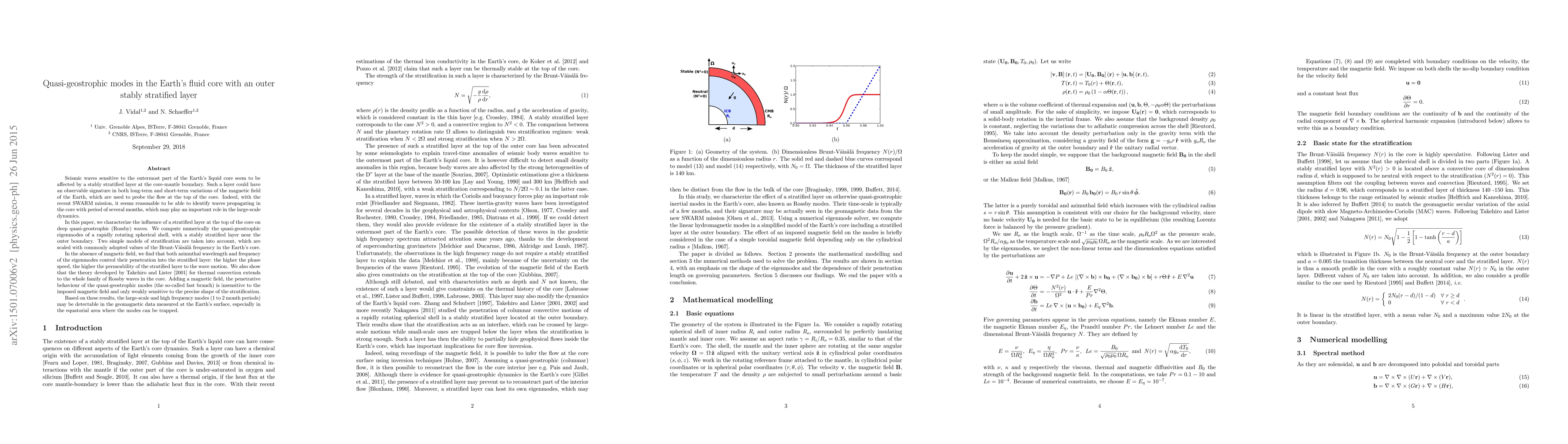 This paper investigates the influence of a stably stratified layer at the Earth's core-mantle boundary on quasi-geostrophic (Rossby) waves using numerical simulations. It finds that wave penetration into the stratified layer depends on wave frequency and azimuthal wavelength, with higher phase speeds allowing greater penetration. The study also shows that magnetic fields have a minimal effect on these waves, suggesting that high-frequency modes may be detectable in geomagnetic data.