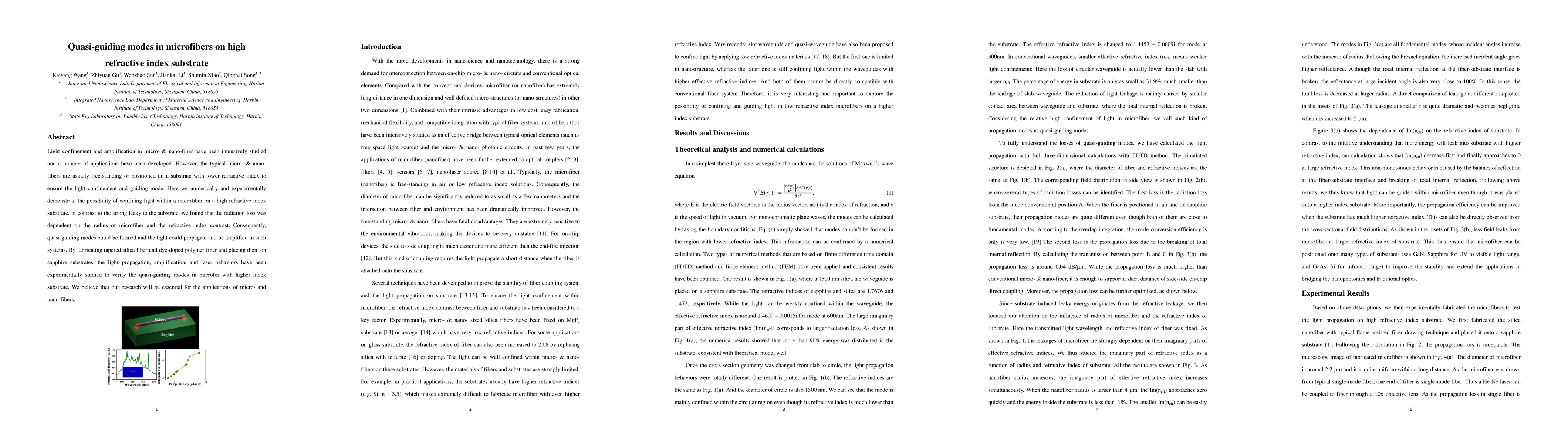 Light confinement and amplification in micro- & nano-fiber have been intensively studied and a number of applications have been developed. However, the typical micro- & anno- fibers are usually free-standing or positioned on a substrate with lower refractive index to ensure the light confinement and guiding mode. Here we numerically and experimentally demonstrate the possibility of confining light within a microfiber on a high refractive index substrate. In contrast to the strong leaky to the substrate, we found that the radiation loss was dependent on the radius of microfiber and the refractive index contrast. Consequently, quasi-guiding modes could be formed and the light could propagate and be amplified in such systems. By fabricating tapered silica fiber and dye-doped polymer fiber and placing them on sapphire substrates, the light propagation, amplification, and laser behaviors have been experimentally studied to verify the quasi-guiding modes in microfer with higher index substrate. We believe that our research will be essential for the applications of micro- and nano-fibers.