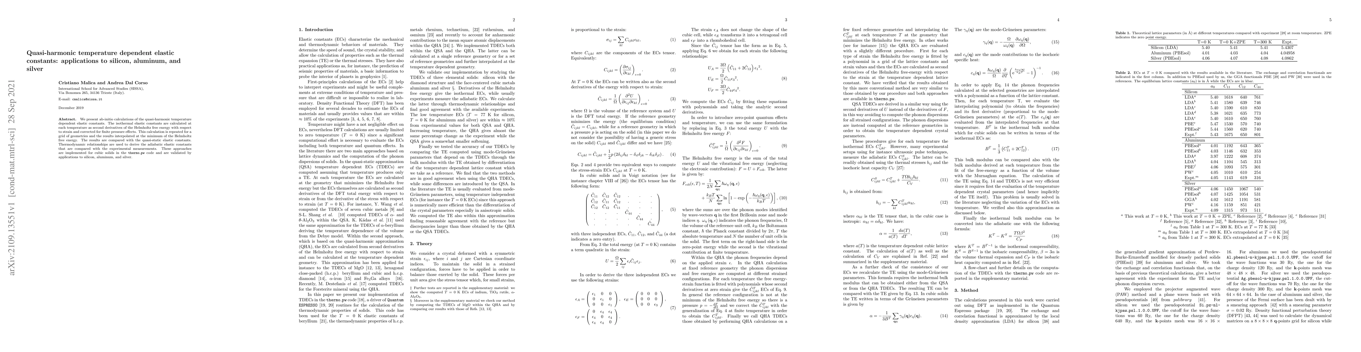 This paper presents ab-initio calculations of quasi-harmonic temperature-dependent elastic constants for silicon, aluminum, and silver using the $\texttt{thermo_pw}$ code. The isothermal elastic constants are derived from second derivatives of the Helmholtz free energy and compared with quasi-static constants and experimental measurements.
