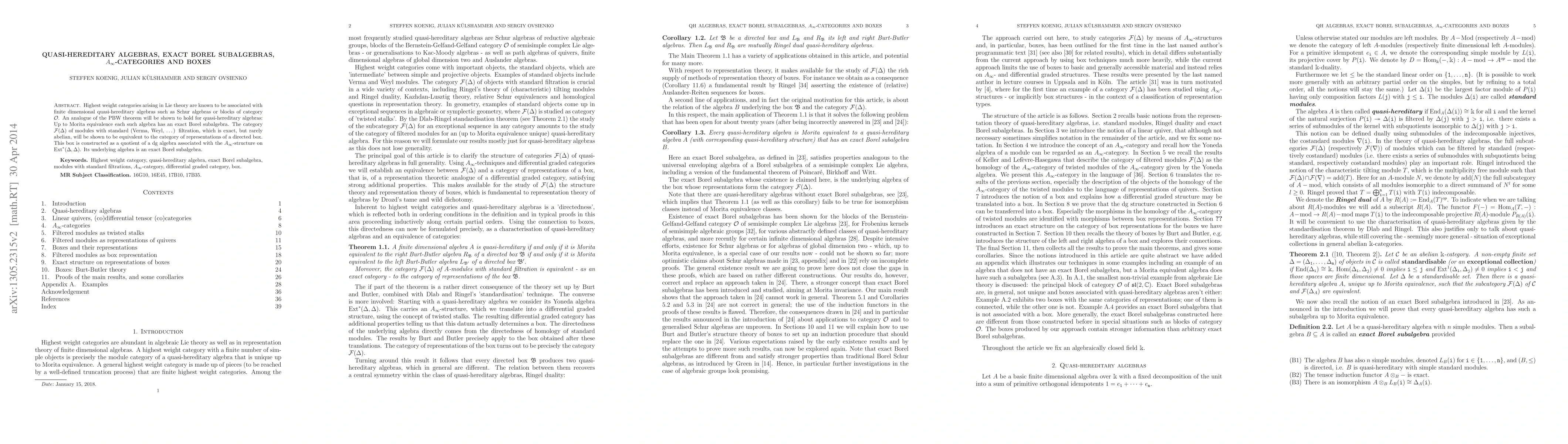 Highest weight categories arising in Lie theory are known to be associated with finite dimensional quasi-hereditary algebras such as Schur algebras or blocks of category $\mathcal O$. An analogue of the PBW theorem will be shown to hold for quasi-hereditary algebras: Up to Morita equivalence each such algebra has an exact Borel subalgebra. The category $\mathcal{F}(\Delta)$ of modules with standard (Verma, Weyl, \dots) filtration, which is exact, but rarely abelian, will be shown to be equivalent to the category of representations of a directed box. This box is constructed as a quotient of a dg algebra associated with the $A_{\infty}$-structure on $\mathcal{F}(\Delta)$. Its underlying algebra is an exact Borel subalgebra.