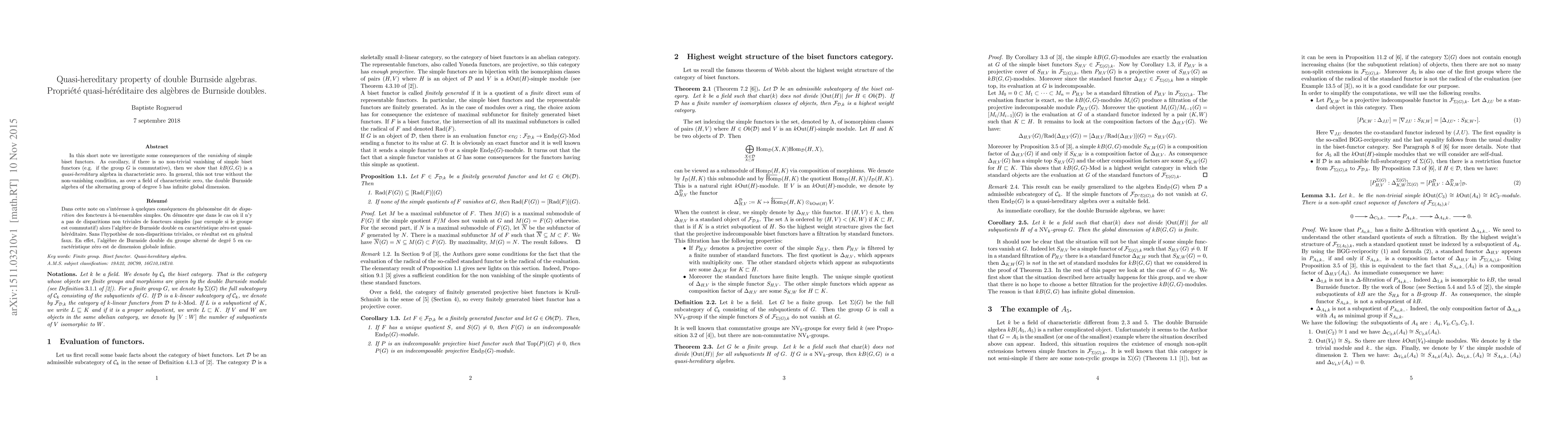 In this short note we investigate some consequences of the vanishing of simple biset functors. As corollary, if there is no non-trivial vanishing of simple biset functors (e.g. if the group is commutative), then we show that the double Burnside algebra is a quasi-hereditary algebra in characteristic zero. In general, this not true without the non-vanishing condition, as over a field of characteristic zero, the double Burnside algebra of the alternating group of degree 5 has infinite global dimension.