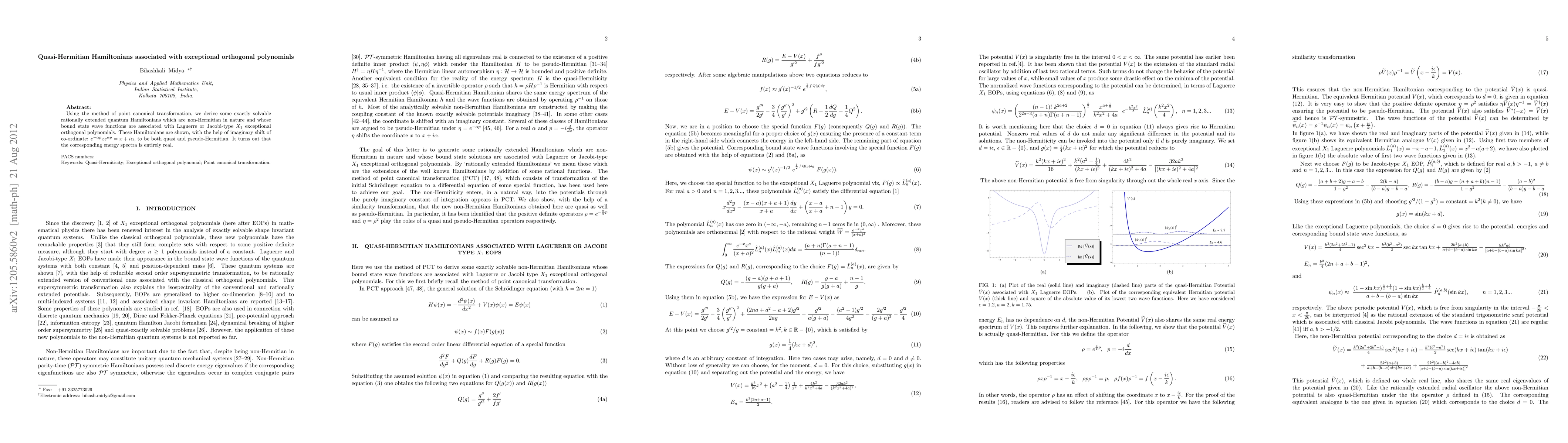This paper derives quasi-Hermitian Hamiltonians using point canonical transformations, showing they are associated with exceptional orthogonal polynomials and possess real energy spectra through an imaginary shift of coordinates. These Hamiltonians are non-Hermitian but exhibit pseudo-Hermitian properties.