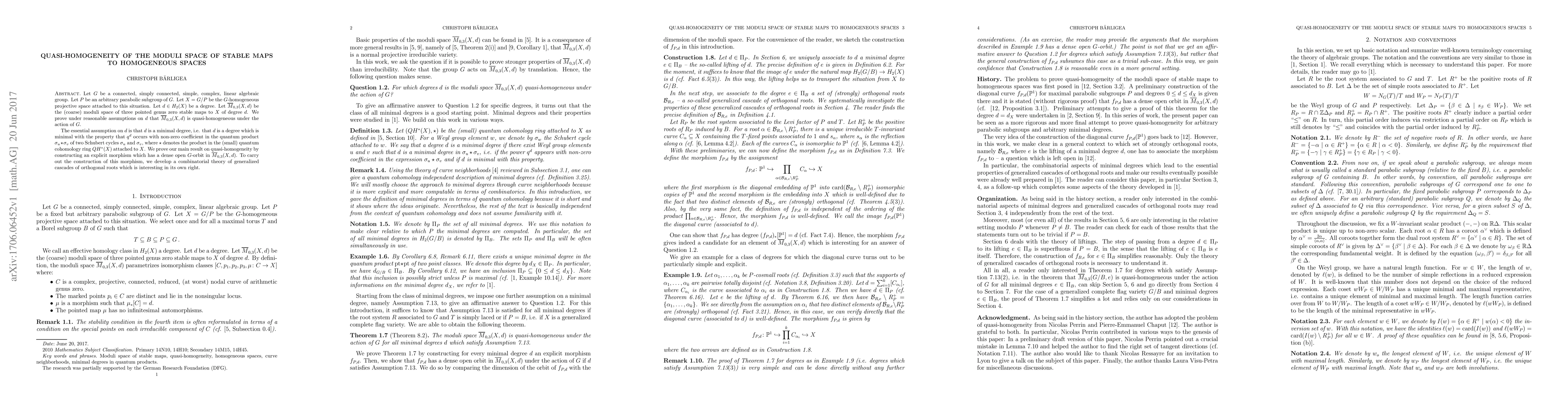 Let $G$ be a connected, simply connected, simple, complex, linear algebraic group. Let $P$ be an arbitrary parabolic subgroup of $G$. Let $X=G/P$ be the $G$-homogeneous projective space attached to this situation. Let $d\in H_2(X)$ be a degree. Let $\overline{M}_{0,3}(X,d)$ be the (coarse) moduli space of three pointed genus zero stable maps to $X$ of degree $d$. We prove under reasonable assumptions on $d$ that $\overline{M}_{0,3}(X,d)$ is quasi-homogeneous under the action of $G$. The essential assumption on $d$ is that $d$ is a minimal degree, i.e. that $d$ is a degree which is minimal with the property that $q^d$ occurs with non-zero coefficient in the quantum product $\sigma_u\star\sigma_v$ of two Schubert cycles $\sigma_u$ and $\sigma_v$, where $\star$ denotes the product in the (small) quantum cohomology ring $QH^*(X)$ attached to $X$. We prove our main result on quasi-homogeneity by constructing an explicit morphism which has a dense open $G$-orbit in $\overline{M}_{0,3}(X,d)$. To carry out the construction of this morphism, we develop a combinatorial theory of generalized cascades of orthogonal roots which is interesting in its own right.