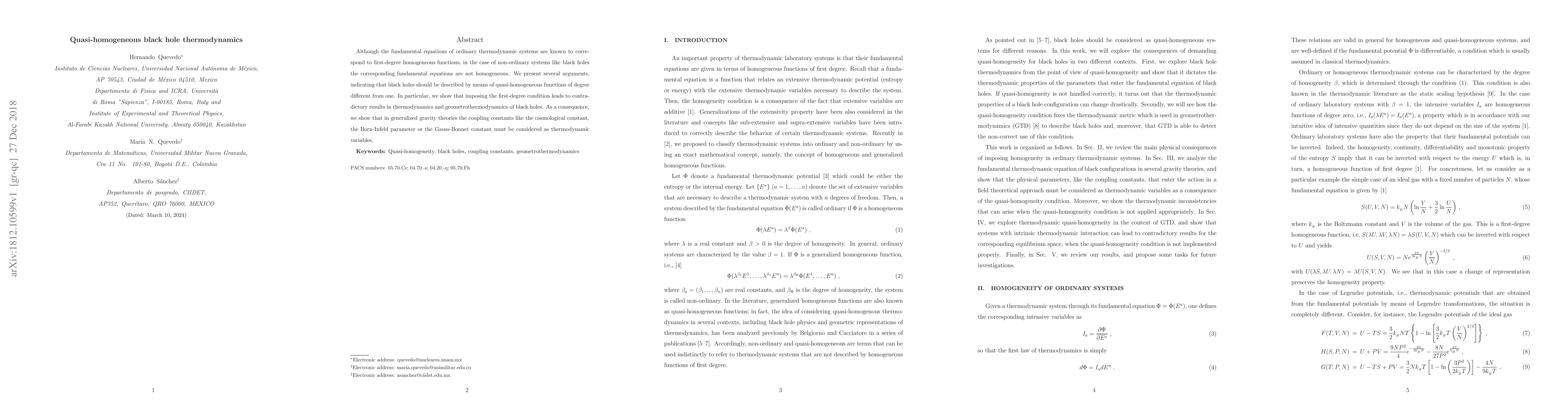 Although the fundamental equations of ordinary thermodynamic systems are known to correspond to first-degree homogeneous functions, in the case of non-ordinary systems like black holes the corresponding fundamental equations are not homogeneous. We present several arguments, indicating that black holes should be described by means of quasi-homogeneous functions of degree different from one. In particular, we show that imposing the first-degree condition leads to contradictory results in thermodynamics and geometrothermodynamics of black holes. As a consequence, we show that in generalized gravity theories the coupling constants like the cosmological constant, the Born-Infeld parameter or the Gauss-Bonnet constant must be considered as thermodynamic variables.
