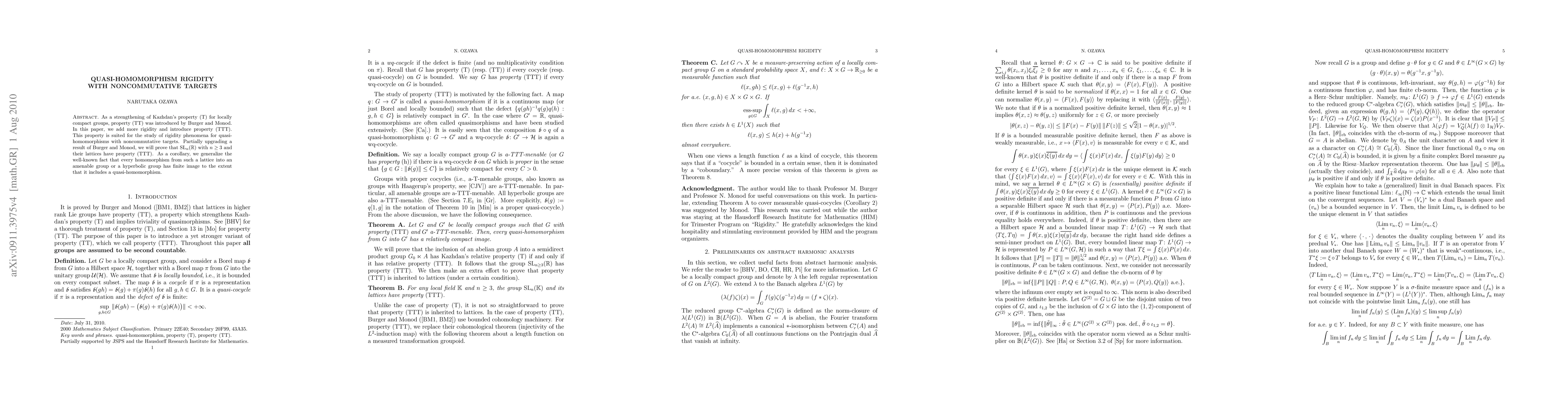 This paper introduces property (TTT), a strengthening of Kazhdan's property (T) for locally compact groups, to study rigidity phenomena for quasi-homomorphisms with noncommutative targets, proving it for SL(n,R) lattices and generalizing known facts about homomorphisms into amenable or hyperbolic groups.
