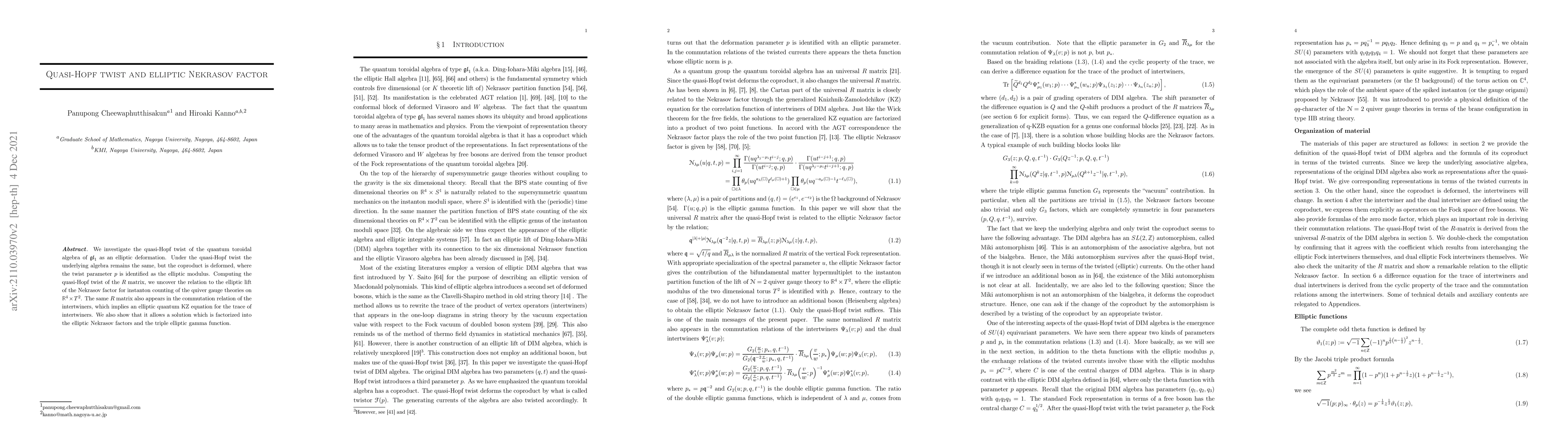 We investigate the quasi-Hopf twist of the quantum toroidal algebra of $\mathfrak{gl}_1$ as an elliptic deformation. Under the quasi-Hopf twist the underlying algebra remains the same, but the coproduct is deformed, where the twist parameter $p$ is identified as the elliptic modulus. Computing the quasi-Hopf twist of the $R$ matrix, we uncover the relation to the elliptic lift of the Nekrasov factor for instanton counting of the quiver gauge theories on $\mathbb{R}^4 \times T^2$. The same $R$ matrix also appears in the commutation relation of the intertwiners, which implies an elliptic quantum KZ equation for the trace of intertwiners. We also show that it allows a solution which is factorized into the elliptic Nekrasov factors and the triple elliptic gamma function.