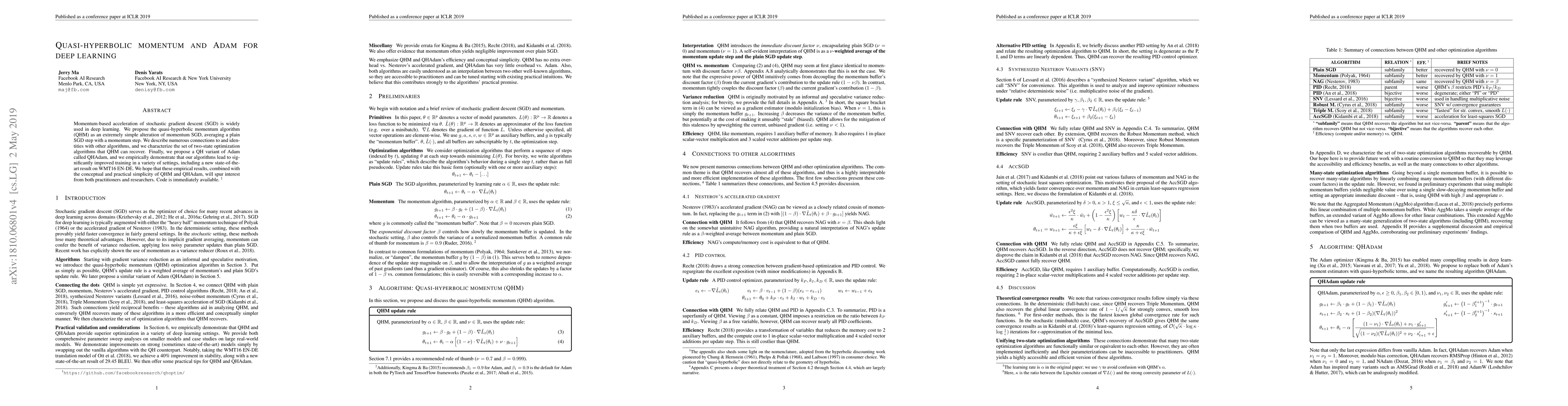 The paper introduces Quasi-hyperbolic momentum (QHM), a simple modification of momentum SGD that averages plain SGD steps with momentum steps. QHM is shown to encompass various optimization algorithms and improve training performance, including a new state-of-the-art on WMT16 EN-DE. The authors also propose QHAdam, a QHM variant of Adam, with open-source code availability.