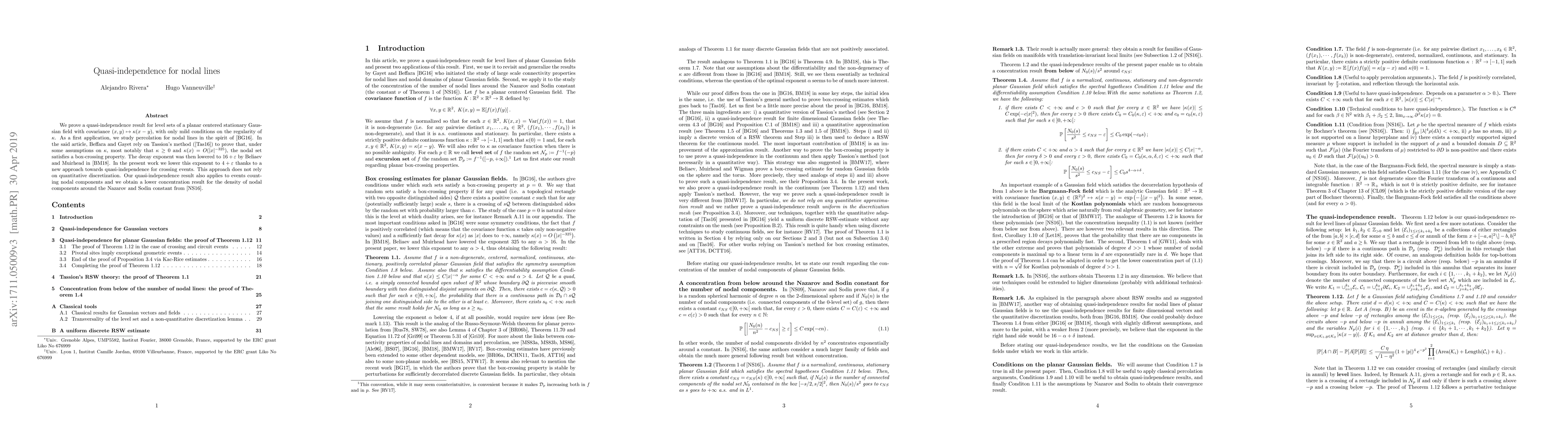We prove a quasi-independence result for level sets of a planar centered stationary Gaussian field with covariance $(x,y)\mapsto\kappa(x-y)$. As a first application, we study percolation for nodal lines in the spirit of [BG16]. In the said article, Beffara and Gayet rely on Tassion's method ([Tas16]) to prove that, under some assumptions on $\kappa$, most notably that $\kappa \geq 0$ and $\kappa(x)=O(|x|^{-325})$, the nodal set satisfies a box-crossing property. The decay exponent was then lowered to $16+\varepsilon$ by Beliaev and Muirhead in [BM17]. In the present work we lower this exponent to $4+\varepsilon$ thanks to a new approach towards quasi-independence for crossing events. This approach does not rely on quantitative discretization. Our quasi-independence result also applies to events counting nodal components and we obtain a lower concentration result for the density of nodal components around the Nazarov and Sodin constant from [NS15].