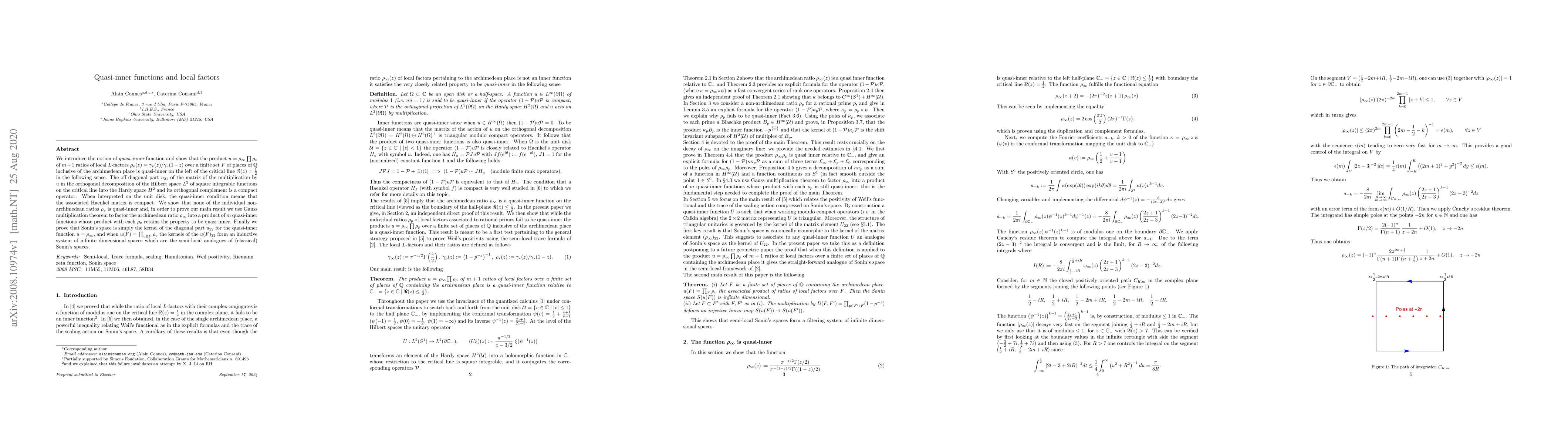 The paper introduces quasi-inner functions and examines their properties, particularly focusing on the product of local L-factors over a finite set of places of the rational numbers, including the archimedean place.