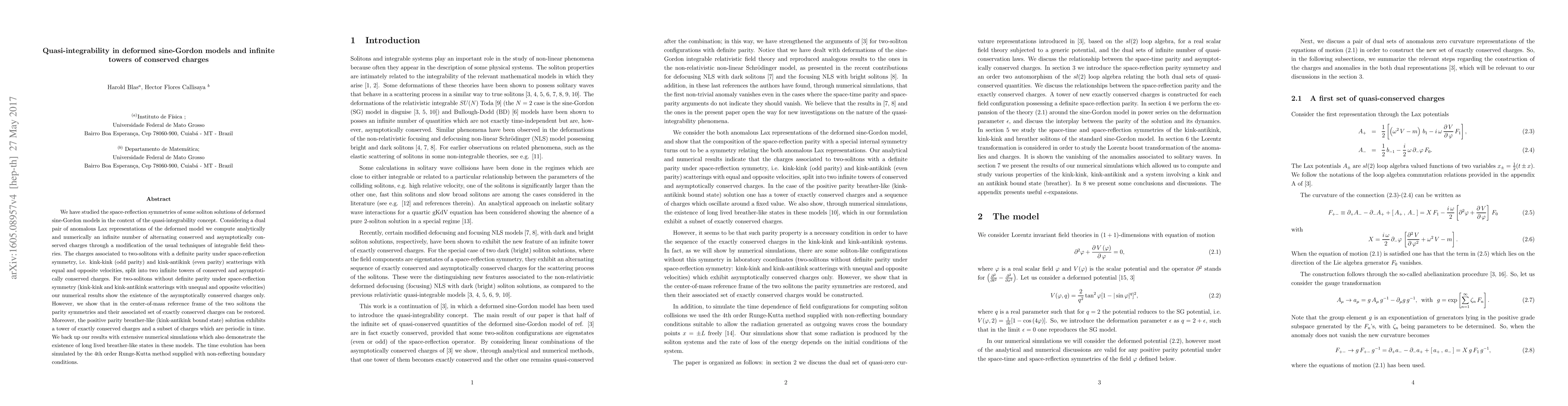 This paper investigates quasi-integrability in deformed sine-Gordon models, revealing an infinite tower of conserved and asymptotically conserved charges through analytical and numerical methods. It demonstrates the restoration of parity symmetries and associated conserved charges in the center-of-mass frame, and supports findings with extensive numerical simulations using the 4th order Runge-Kutta method.