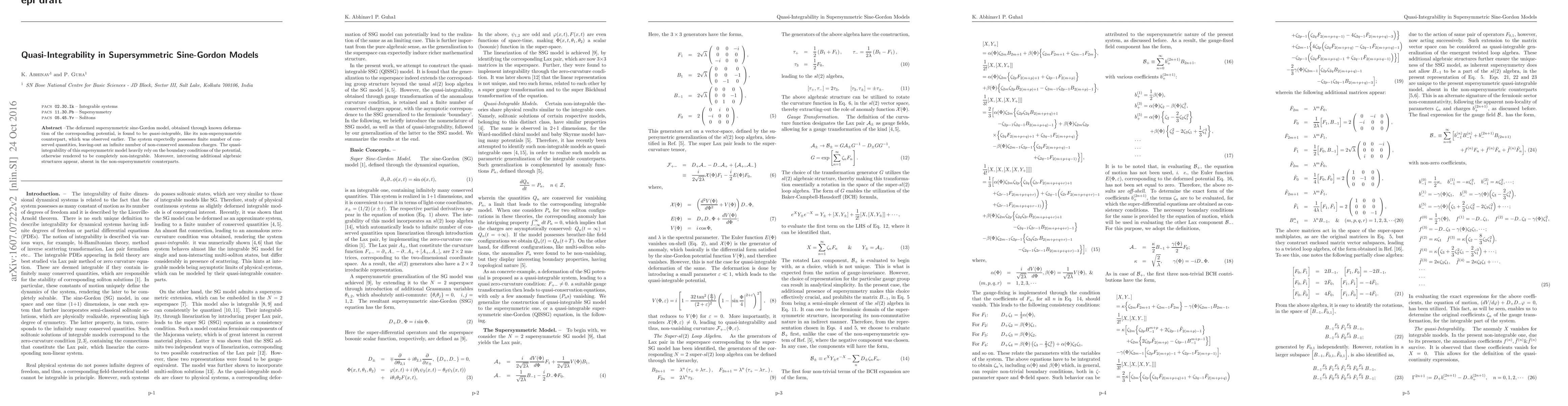 This paper explores the quasi-integrability of the deformed supersymmetric sine-Gordon model, revealing a finite number of conserved quantities and an infinite set of anomalous charges. The model's quasi-integrability is contingent on specific boundary conditions and introduces new algebraic structures not present in its non-supersymmetric version.