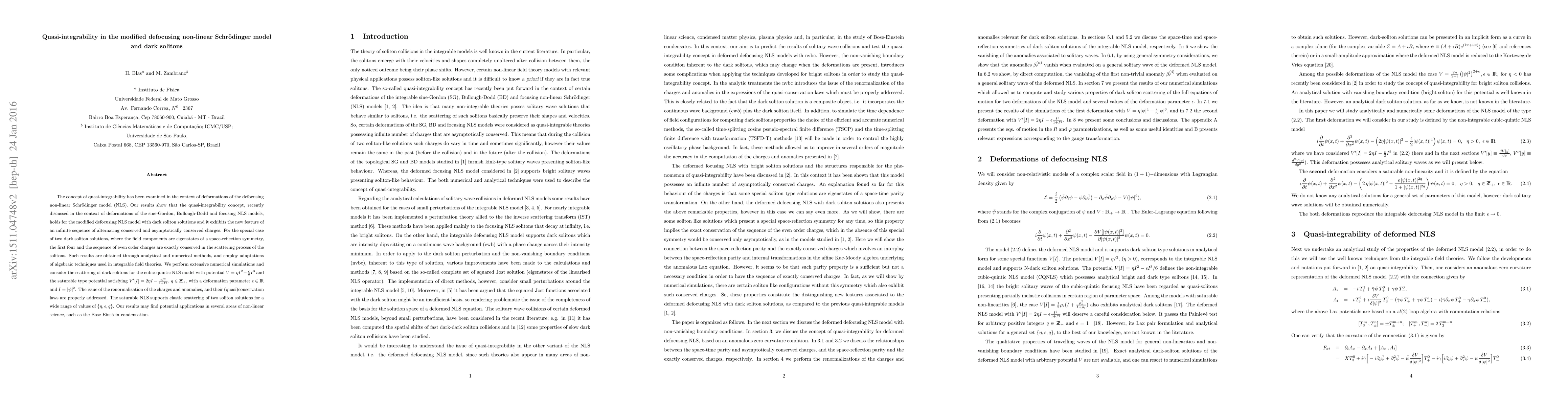 This paper investigates quasi-integrability in the modified defocusing non-linear Schrödinger model, revealing an infinite sequence of conserved charges and demonstrating exact conservation for two dark soliton solutions. Numerical simulations support these findings and suggest potential applications in non-linear science, including Bose-Einstein condensation.