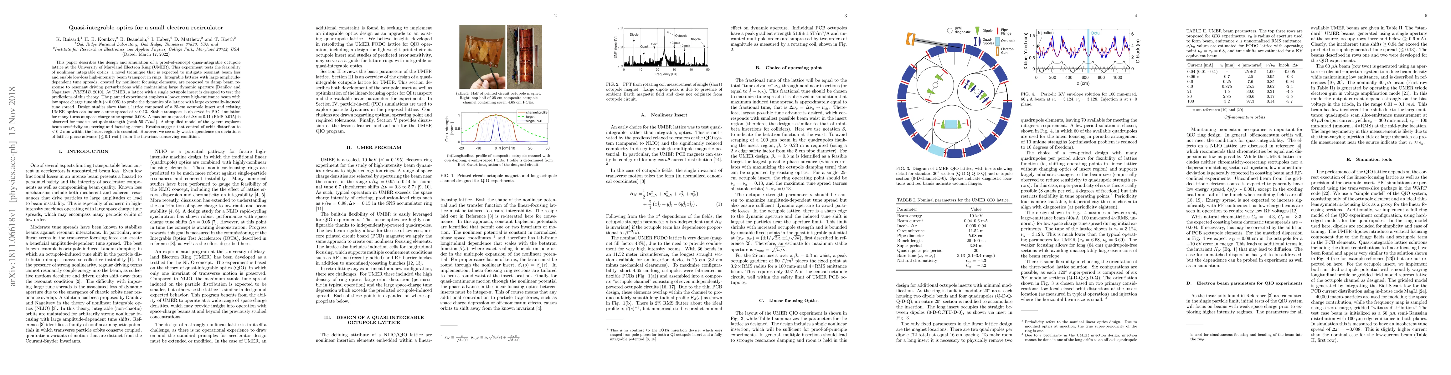 This paper describes the design and simulation of a proof-of-concept quasi-integrable octupole lattice at the University of Maryland Electron Ring (UMER). This experiment tests the feasibility of nonlinear integrable optics, a novel technique that is expected to mitigate resonant beam loss and enable low-loss high-intensity beam transport in rings. Integrable lattices with large amplitude-dependent tune spreads, created by nonlinear focusing elements, are proposed to damp beam response to resonant driving perturbations while maintaining large dynamic aperture [Danilov and Nagaitsev PRSTAB 2010]. At UMER, a lattice with a single octupole insert is designed to test the predictions of this theory. The planned experiment employs a low-current high-emittance beam with low space charge tune shift (~0.005) to probe the dynamics of a lattice with large externally-induced tune spread. Design studies show that a lattice composed of a 25-cm octupole insert and existing UMER optics can induce a tune spread of \sim 0.13. Stable transport is observed in PIC simulation for many turns at space charge tune spread 0.008. A maximum spread of dnu = 0.11 (RMS 0.015) is observed for modest octupole strength (peak 50 T/m^3). A simplified model of the system explores beam sensitivity to steering and focusing errors. Results suggest that control of orbit distortion to <0.2 mm within the insert region is essential. However, we see only weak dependence on deviations of lattice phase advance (<=0.1 rad.) from the invariant-conserving condition.