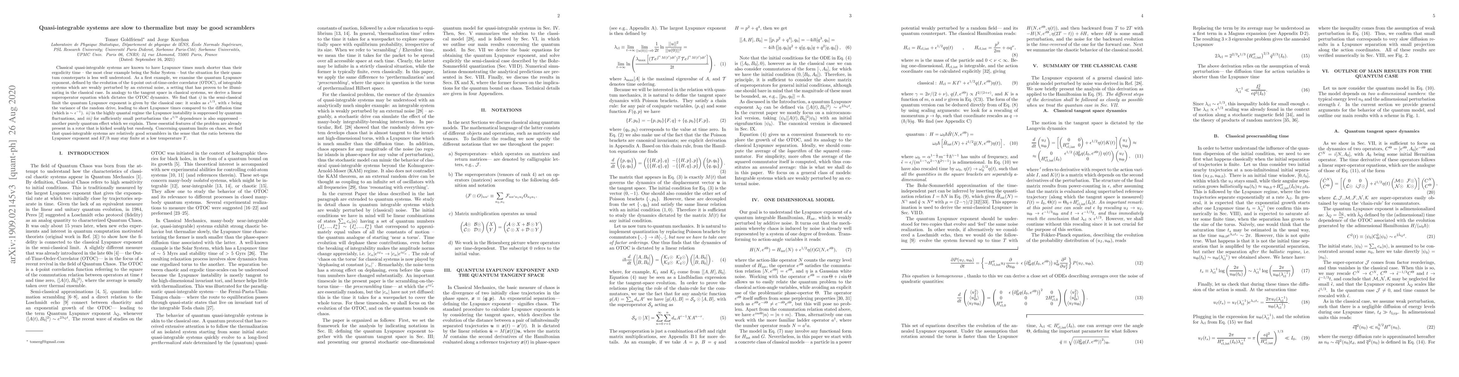 The research explores quantum Lyapunov exponents in quasi-integrable systems, finding they exhibit short Lyapunov times compared to diffusion times, similar to classical systems. Quantum fluctuations suppress Lyapunov instability in highly quantal regimes, and for small perturbations, the u03bc^1/3 dependence is also suppressed. Even simple systems like a kicked rotor display these features, and quasi-integrable systems are identified as relatively good scramblers even at low temperatures.