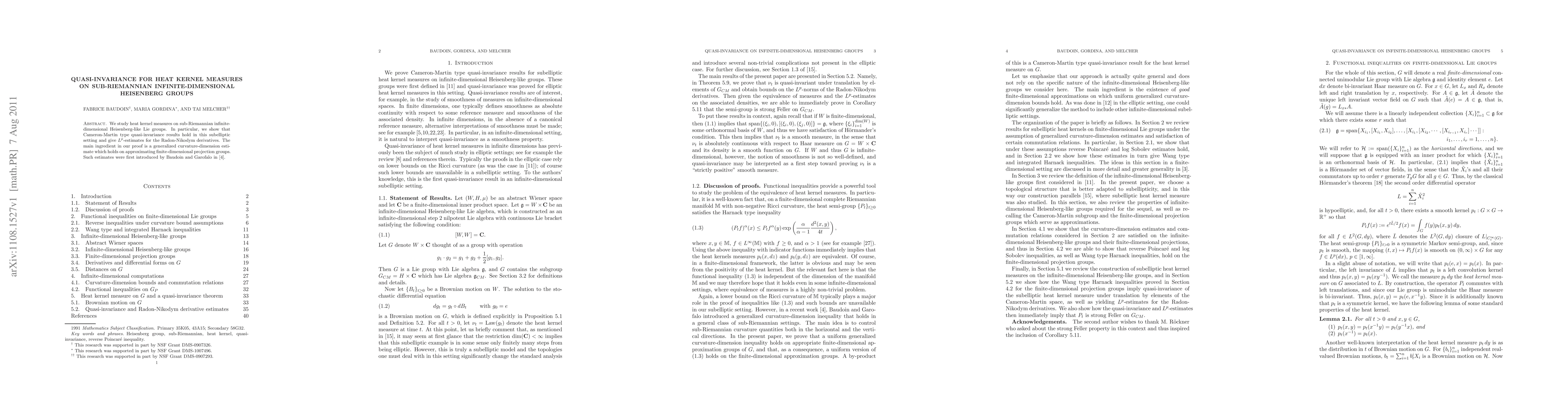 This paper investigates heat kernel measures on sub-Riemannian infinite-dimensional Heisenberg-like Lie groups, demonstrating quasi-invariance results akin to Cameron-Martin theory. It provides $L^p$-estimates for the Radon-Nikodym derivatives, relying on a generalized curvature-dimension estimate from Baudoin and Garofalo.