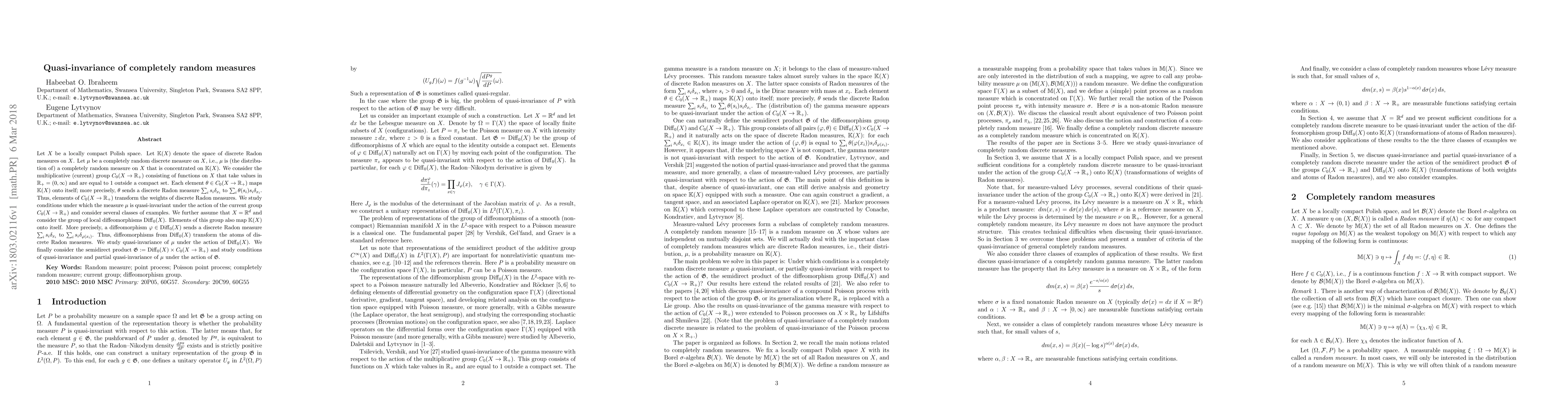 Let $X$ be a locally compact Polish space. Let $\mathbb K(X)$ denote the space of discrete Radon measures on $X$. Let $\mu$ be a completely random discrete measure on $X$, i.e., $\mu$ is (the distribution of) a completely random measure on $X$ that is concentrated on $\mathbb K(X)$. We consider the multiplicative (current) group $C_0(X\to\mathbb R_+)$ consisting of functions on $X$ that take values in $\mathbb R_+=(0,\infty)$ and are equal to 1 outside a compact set. Each element $\theta\in C_0(X\to\mathbb R_+)$ maps $\mathbb K(X)$ onto itself; more precisely, $\theta$ sends a discrete Radon measure $\sum_i s_i\delta_{x_i}$ to $\sum_i \theta(s_i)s_i\delta_{x_i}$. Thus, elements of $C_0(X\to\mathbb R_+)$ transform the weights of discrete Radon measures. We study conditions under which the measure $\mu$ is quasi-invariant under the action of the current group $C_0(X\to\mathbb R_+)$ and consider several classes of examples. We further assume that $X=\mathbb R^d$ and consider the group of local diffeomorphisms $\operatorname{Diff}_0(X)$. Elements of this group also map $\mathbb K(X)$ onto itself. More precisely, a diffeomorphism $\varphi\in \operatorname{Diff}_0(X)$ sends a discrete Radon measure $\sum_i s_i\delta_{x_i}$ to $\sum_i s_i\delta_{\varphi(x_i)}$. Thus, diffeomorphisms from $\operatorname{Diff}_0(X)$ transform the atoms of discrete Radon measures. We study quasi-invariance of $\mu$ under the action of $\operatorname{Diff}_0(X)$. We finally consider the semidirect product $\mathfrak G:=\operatorname{Diff}_0(X)\times C_0(X\to \mathbb R_+)$ and study conditions of quasi-invariance and partial quasi-invariance of $\mu$ under the action of $\mathfrak G$.