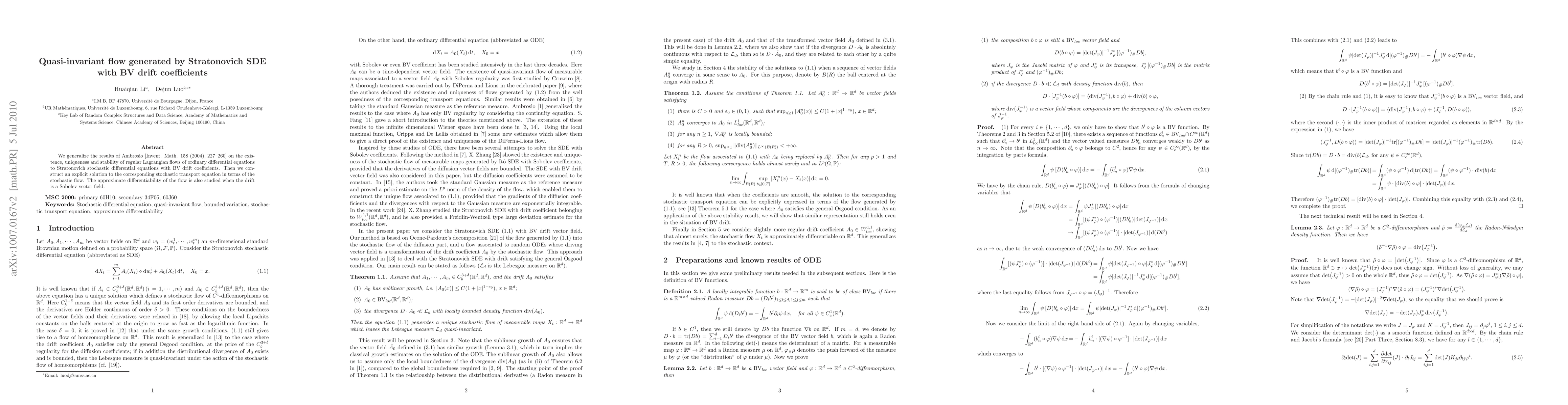 We generalize the results of Ambrosio [Invent. Math. 158 (2004), 227--260] on the existence, uniqueness and stability of regular Lagrangian flows of ordinary differential equations to Stratonovich stochastic differential equations with BV drift coefficients. Then we construct an explicit solution to the corresponding stochastic transport equation in terms of the stochastic flow. The approximate differentiability of the flow is also studied when the drift is a Sobolev vector field.