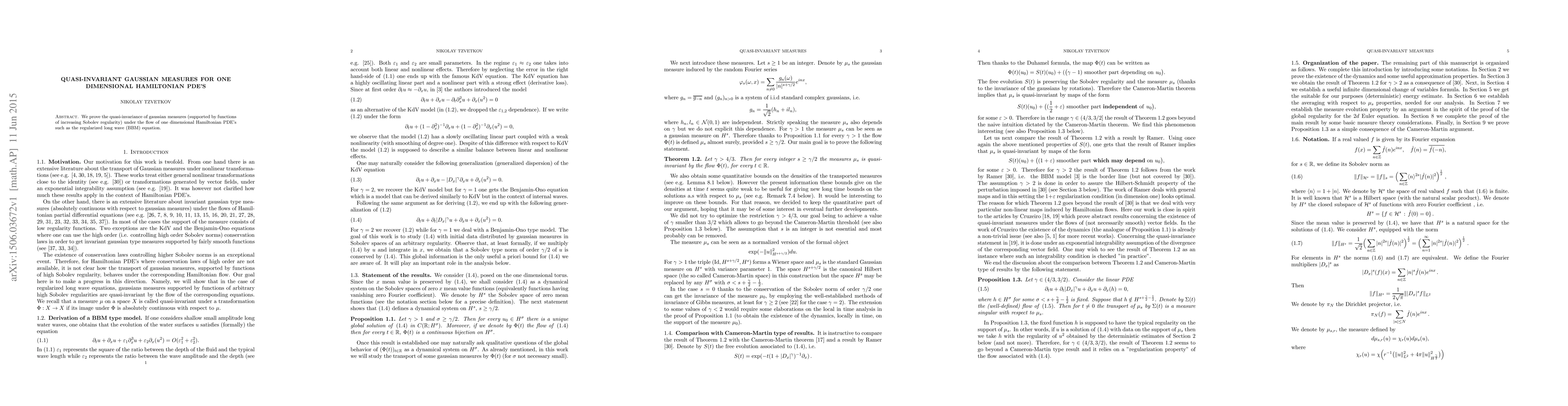 This paper proves the quasi-invariance of Gaussian measures associated with increasing Sobolev regularity functions under the flow of one-dimensional Hamiltonian PDEs, specifically the regularized long wave (BBM) equation. The result provides insight into the behavior of these measures in the context of Hamiltonian dynamics.
