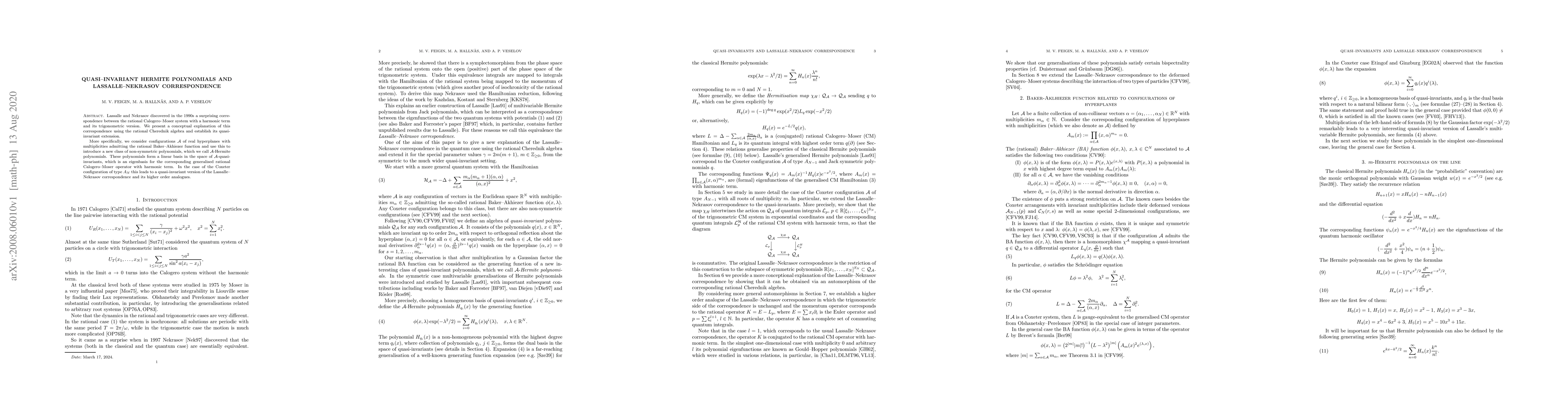 Lassalle and Nekrasov discovered in the 1990s a surprising correspondence between the rational Calogero-Moser system with a harmonic term and its trigonometric version. We present a conceptual explanation of this correspondence using the rational Cherednik algebra and establish its quasi-invariant extension. More specifically, we consider configurations $\mathcal A$ of real hyperplanes with multiplicities admitting the rational Baker-Akhiezer function and use this to introduce a new class of non-symmetric polynomials, which we call $\mathcal A$-Hermite polynomials. These polynomials form a linear basis in the space of $\mathcal A$-quasi-invariants, which is an eigenbasis for the corresponding generalised rational Calogero-Moser operator with harmonic term. In the case of the Coxeter configuration of type $A_N$ this leads to a quasi-invariant version of the Lassalle-Nekrasov correspondence and its higher order analogues.