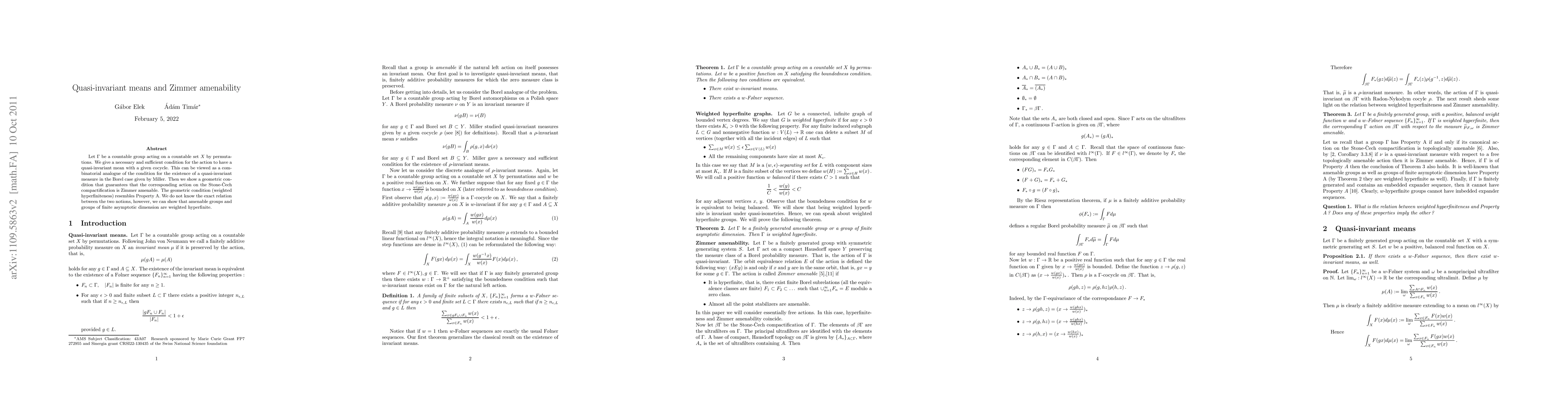 Let $\Gamma$ be a countable group acting on a countable set $X$ by permutations. We give a necessary and sufficient condition for the action to have a quasi-invariant mean with a given cocycle. This can be viewed as a combinatorial analogue of the condition for the existence of a quasi-invariant measure in the Borel case given by Miller. Then we show a geometric condition that guarantees that the corresponding action on the Stone-\v{C}ech compactification is Zimmer amenable. The geometric condition (weighted hyperfiniteness) resembles Property A. We do not know the exact relation between the two notions, however, we can show that amenable groups and groups of finite asymptotic dimension are weighted hyperfinite.