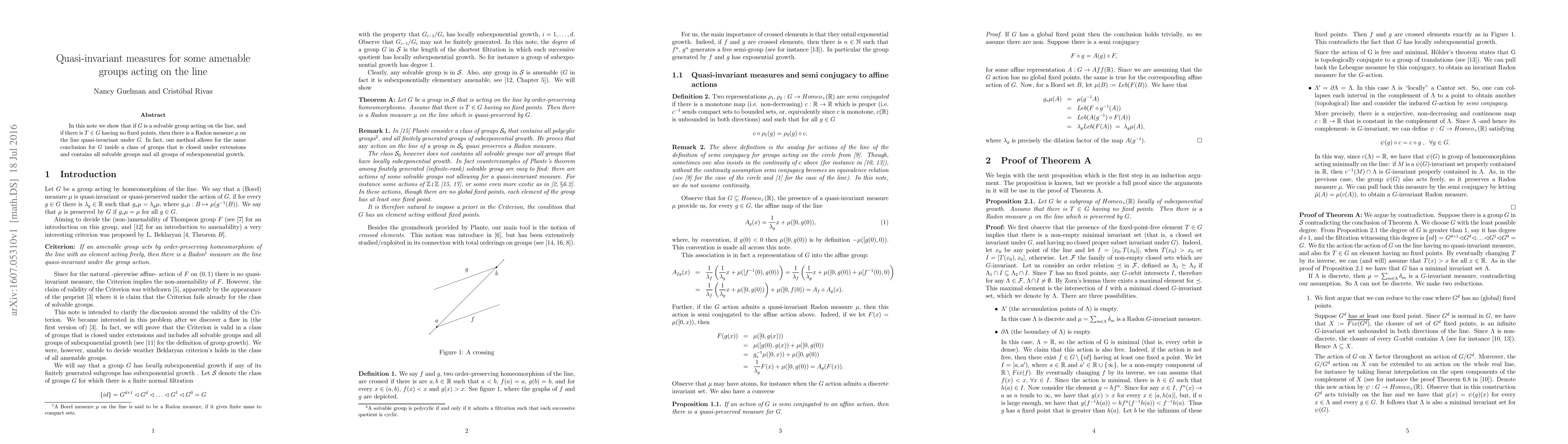 In this note we show that if $G$ is a solvable group acting on the line, and if there is $T\in G$ having no fixed points, then there is a Radon measure $\mu$ on the line quasi-invariant under $G$. In fact, our method allows for the same conclusion for $G$ inside a class of groups that is closed under extensions and contains all solvable groups and all groups of subexponential growth.