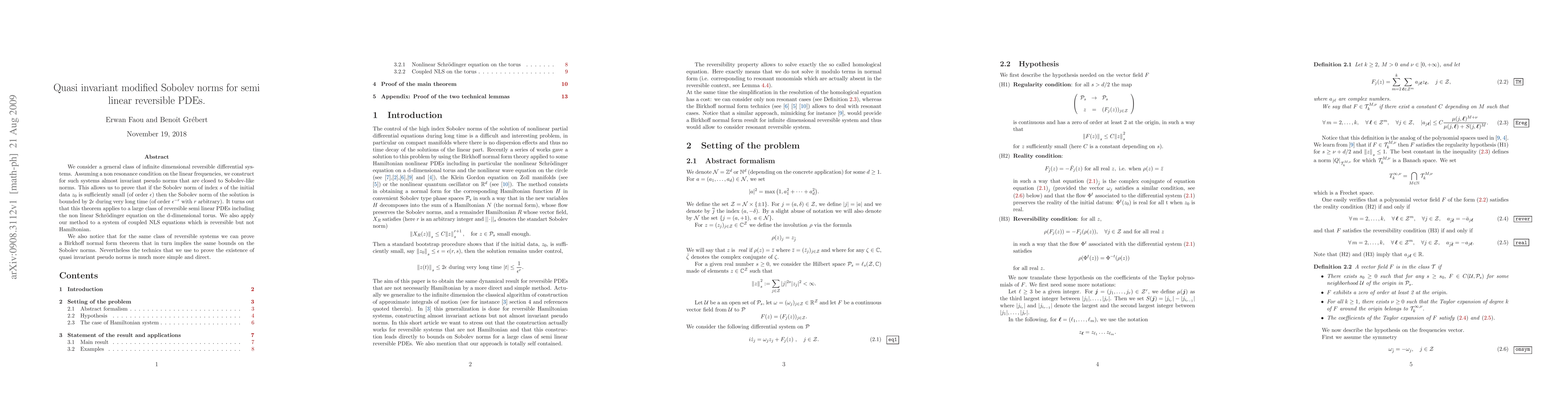 This paper constructs quasi invariant modified Sobolev norms for reversible differential systems, proving that small initial Sobolev norms imply bounded solution norms over long times. The method applies to reversible semi-linear PDEs, including the nonlinear Schrödinger equation, and also to coupled NLS equations, demonstrating simpler techniques for establishing quasi invariant norms.