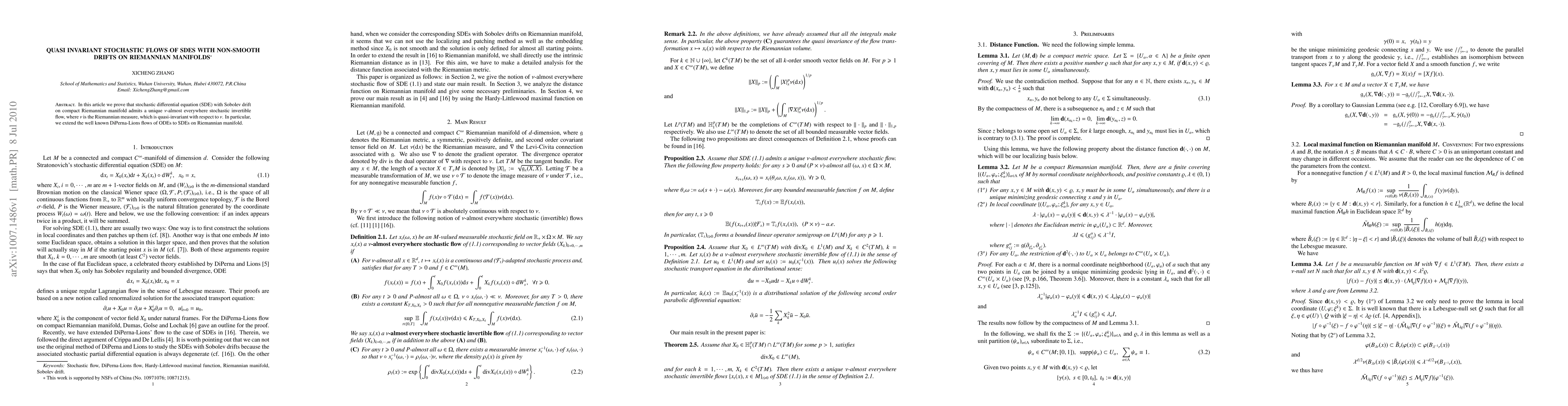 This paper proves that stochastic differential equations with non-smooth drifts on compact Riemannian manifolds admit unique quasi-invariant flows, extending the well-known DiPerna-Lions theorem to SDEs.