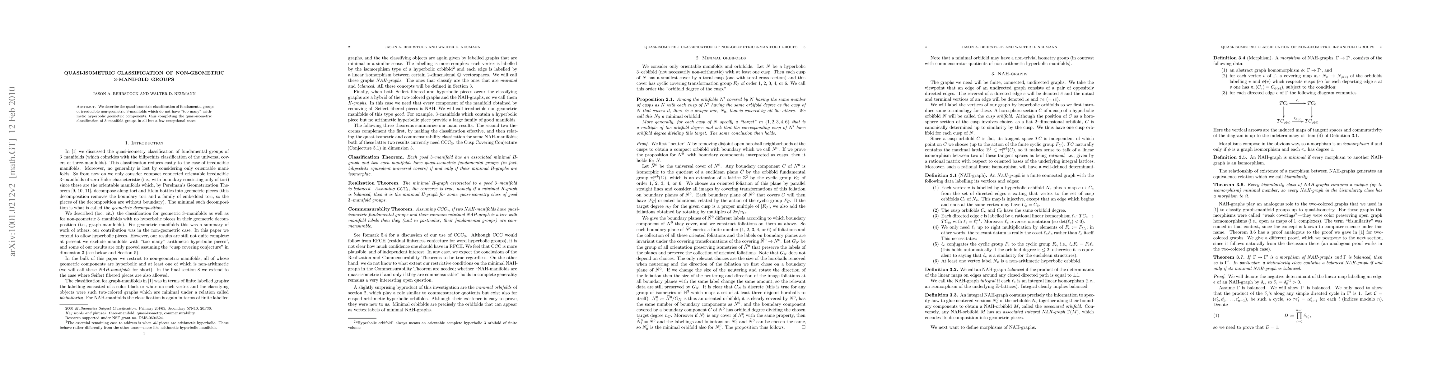 We describe the quasi-isometric classification of fundamental groups of irreducible non-geometric 3-manifolds which do not have "too many" arithmetic hyperbolic geometric components, thus completing the quasi-isometric classification of 3--manifold groups in all but a few exceptional cases.
