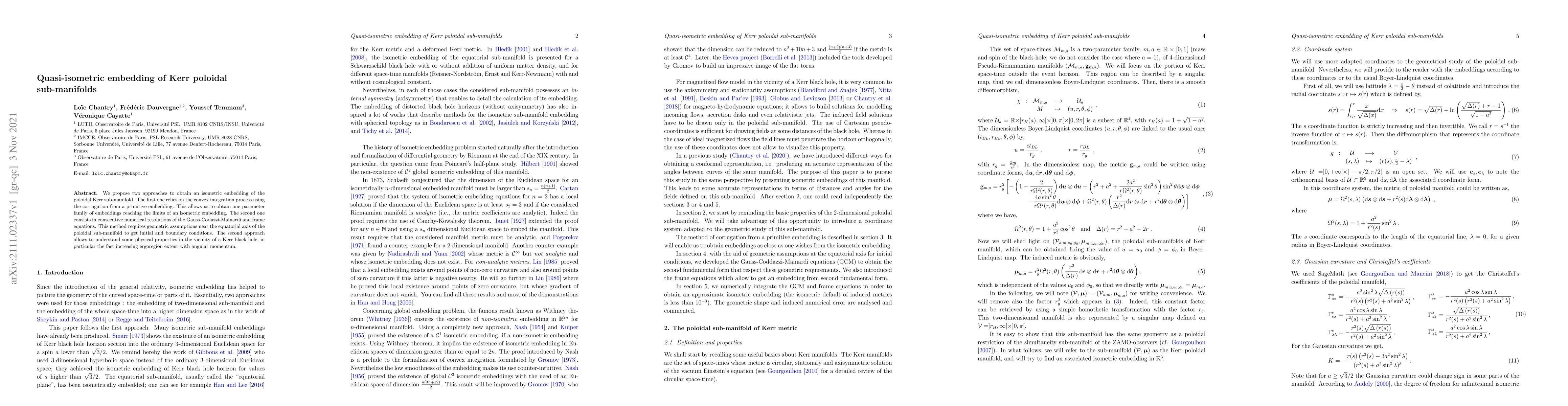 This paper presents two methods for embedding poloidal Kerr sub-manifolds: one using convex integration and corrugation, and the other through numerical resolution of Gauss-Codazzi-Mainardi and frame equations. The second approach also elucidates physical properties near Kerr black holes, notably the growing ergoregion with angular momentum.