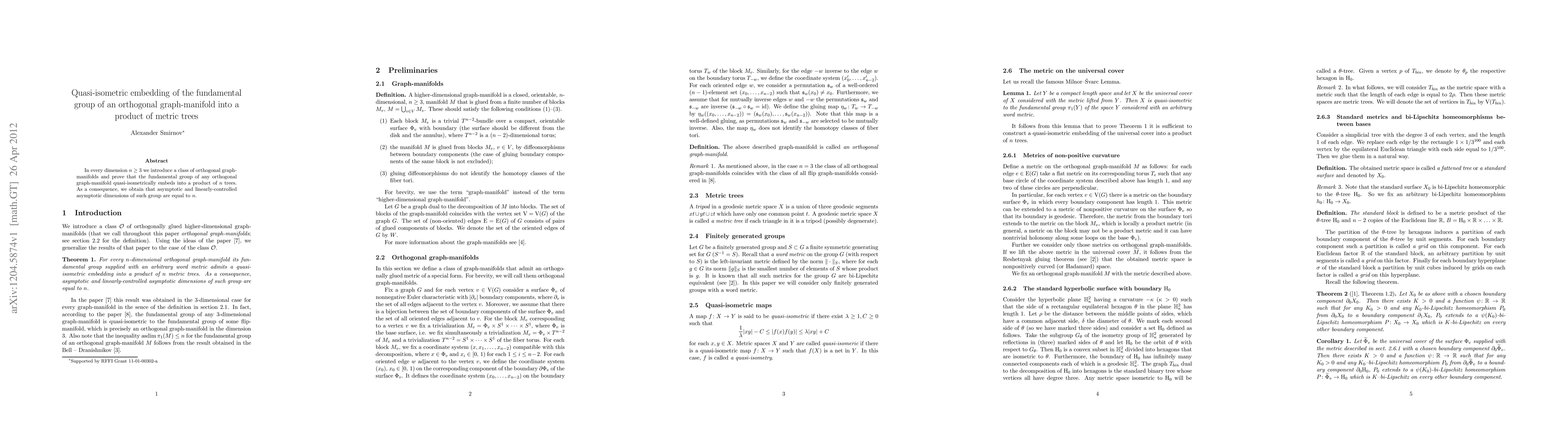 In every dimension $n\ge 3$ we introduce a class of orthogonal graph-manifolds and prove that the fundamental group of any orthogonal graph-manifold quasi-isometrically embeds into a product of $n$ trees. As a consequence, we obtain that asymptotic and linearly-controlled asymptotic dimensions of such group are equal to $n$.