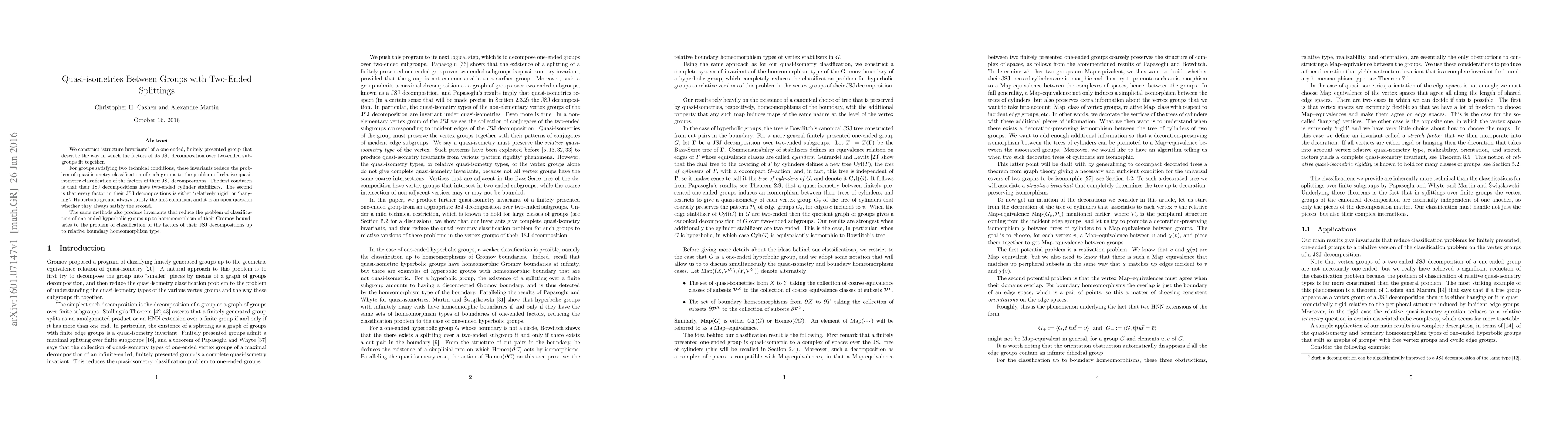 We construct `structure invariants' of a one-ended, finitely presented group that describe the way in which the factors of its JSJ decomposition over two-ended subgroups fit together. For groups satisfying two technical conditions, these invariants reduce the problem of quasi-isometry classification of such groups to the problem of relative quasi-isometry classification of the factors of their JSJ decompositions. The first condition is that their JSJ decompositions have two-ended cylinder stabilizers. The second is that every factor in their JSJ decompositions is either `relatively rigid' or `hanging'. Hyperbolic groups always satisfy the first condition, and it is an open question whether they always satisfy the second. The same methods also produce invariants that reduce the problem of classification of one-ended hyperbolic groups up to homeomorphism of their Gromov boundaries to the problem of classification of the factors of their JSJ decompositions up to relative boundary homeomorphism type.