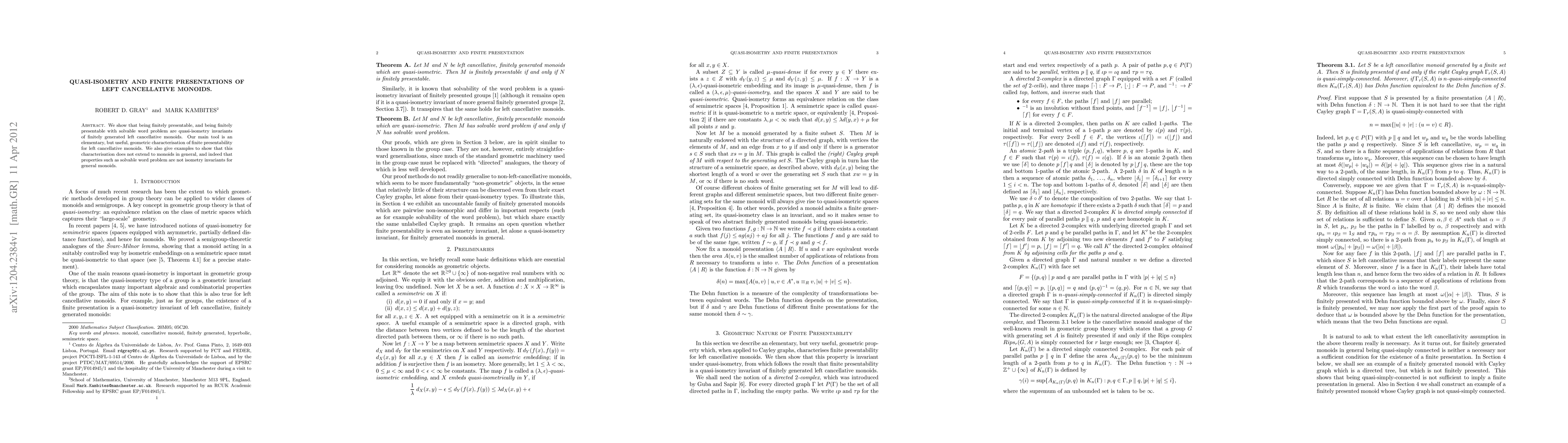 Summary: This paper demonstrates that quasi-isometry preserves finite presentability and solvable word problem in finitely generated left cancellative monoids, using a geometric characterization of finite presentability, and notes that these properties do not extend to general monoids.