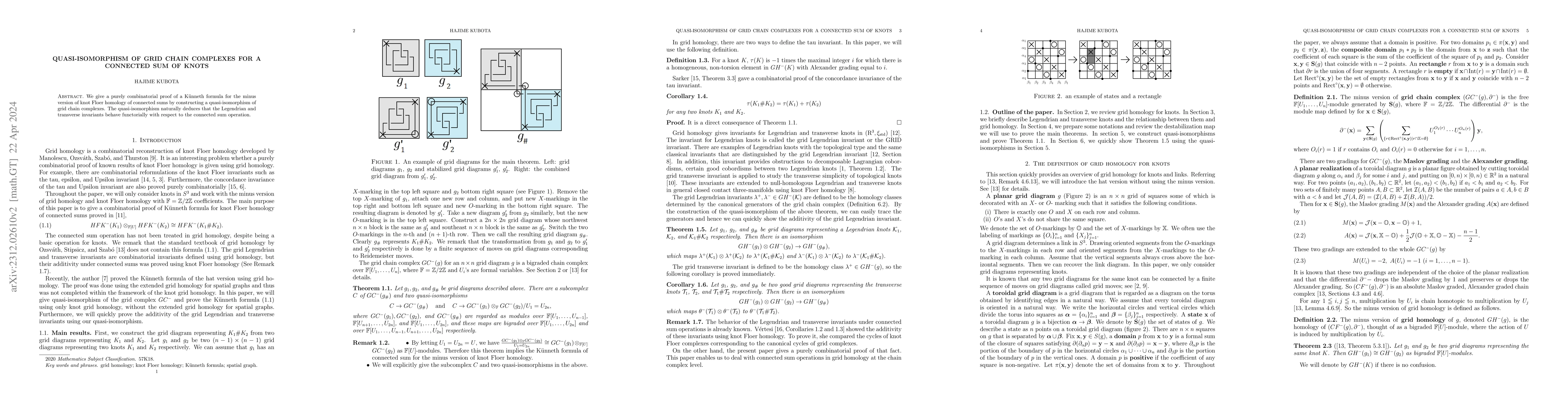 The paper introduces a novel quasi-isomorphism of grid chain complexes for connected sums of knots, providing a combinatorial proof of a Künneth formula for minus knot Floer homology.