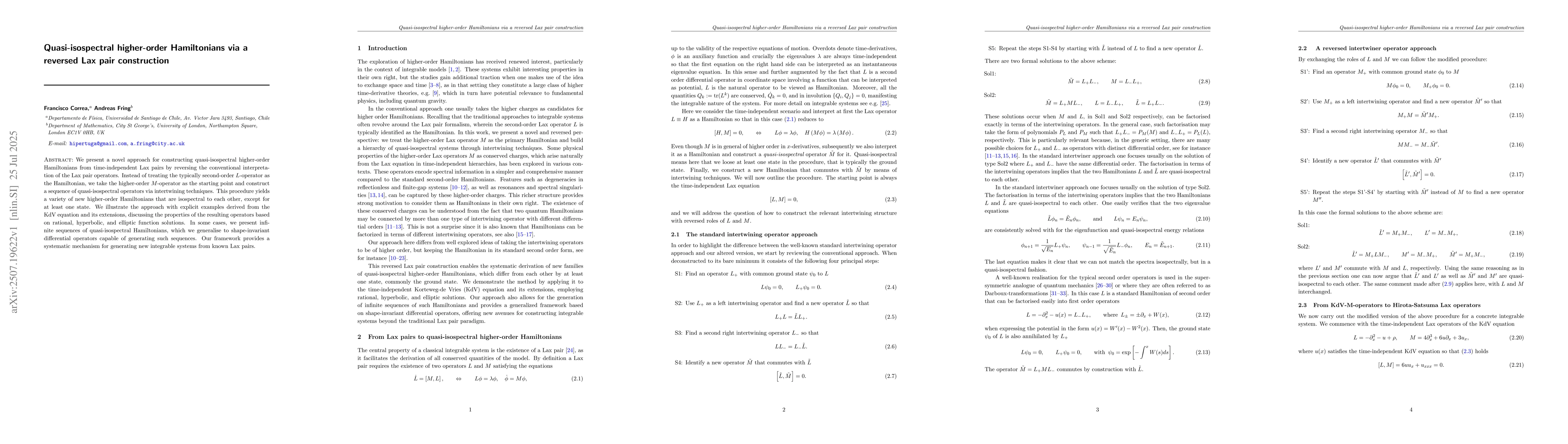 We present a novel approach for constructing quasi-isospectral higher-order Hamiltonians from time-independent Lax pairs by reversing the conventional interpretation of the Lax pair operators. Instead of treating the typically second-order $L$-operator as the Hamiltonian, we take the higher-order $M$-operator as the starting point and construct a sequence of quasi-isospectral operators via intertwining techniques. This procedure yields a variety of new higher-order Hamiltonians that are isospectral to each other, except for at least one state. We illustrate the approach with explicit examples derived from the KdV equation and its extensions, discussing the properties of the resulting operators based on rational, hyperbolic, and elliptic function solutions. In some cases, we present infinite sequences of quasi-isospectral Hamiltonians, which we generalise to shape-invariant differential operators capable of generating such sequences. Our framework provides a systematic mechanism for generating new integrable systems from known Lax pairs.