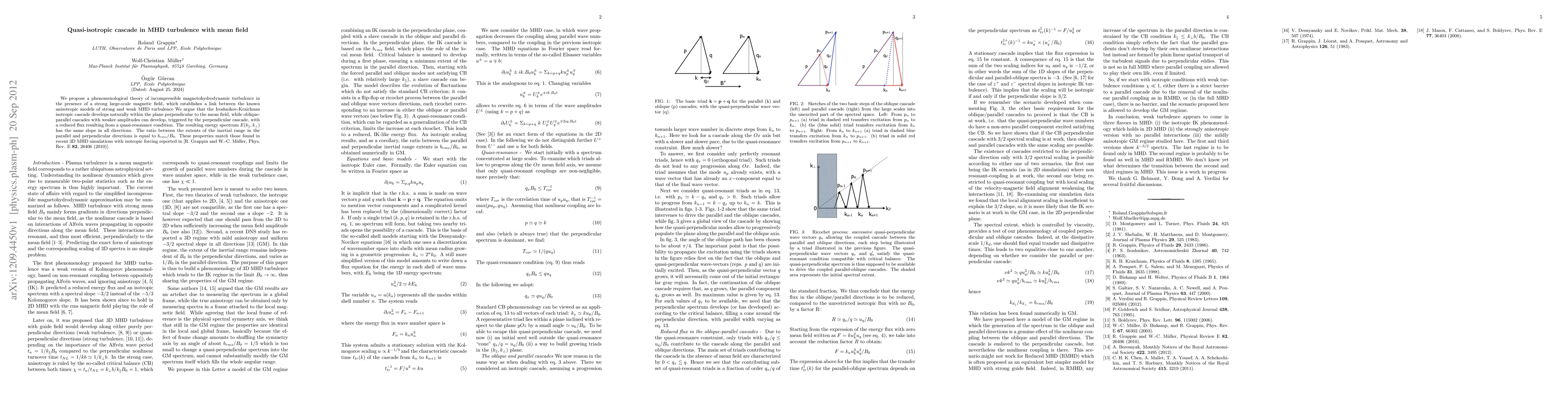 This paper proposes a theory for incompressible magnetohydrodynamic turbulence in strong magnetic fields, showing that an isotropic cascade occurs perpendicular to the mean field, while oblique-parallel cascades develop with reduced flux due to quasi-resonance, maintaining an isotropic energy spectrum. The model's properties align with recent 3D MHD simulations.