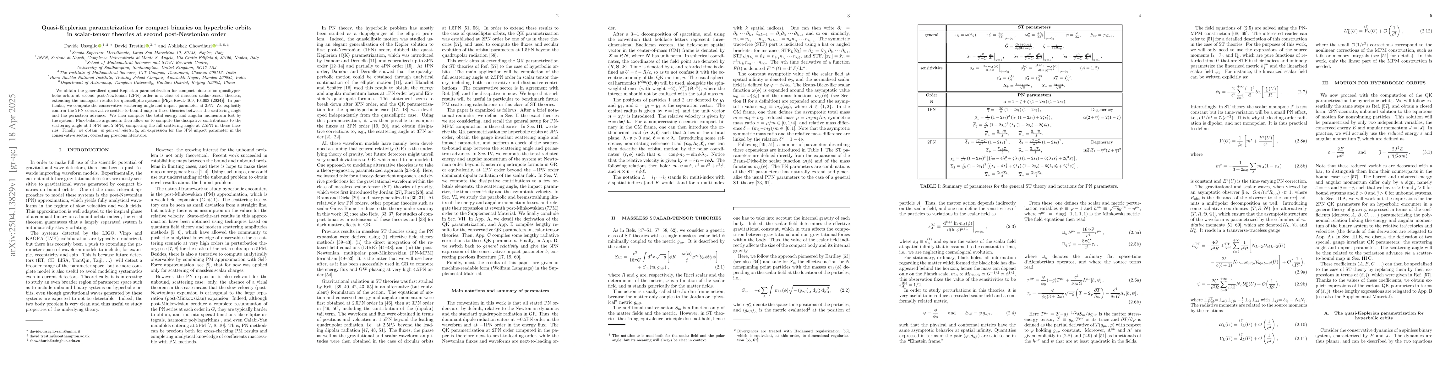 The research employs a quasi-Keplerian parametrization for compact binaries on hyperbolic orbits within scalar-tensor theories, extending previous results to second post-Newtonian (2PN) order.