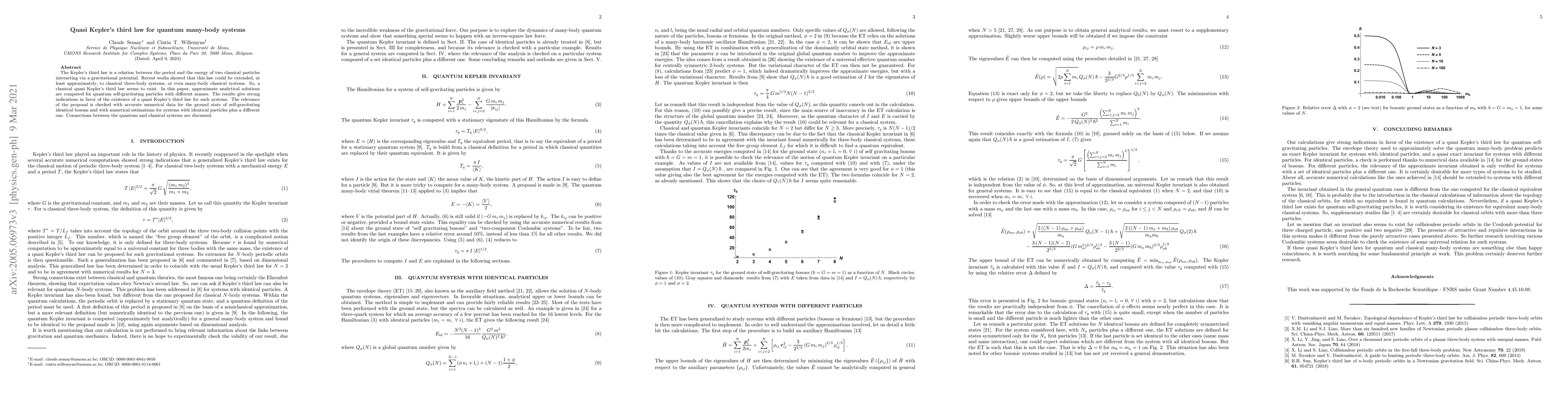 This work extends existing research on Kepler's third law to quantum many-body systems, proposing a quasi Kepler's third law and providing analytical solutions and numerical verifications, which were not previously available for such systems.